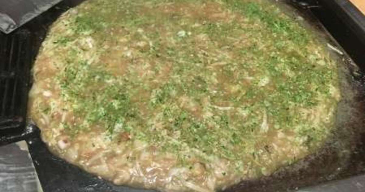 ここのお店の定番もんじゃは、青のりをたっぷりかけるのがおすすめとのことで、言われた通りたっぷりかけて頂きました♪