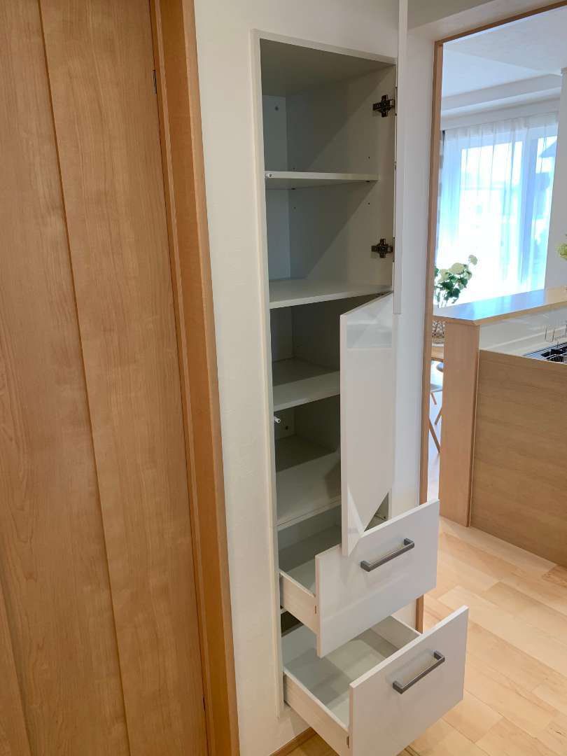 また、洗面室から二階へ動線をスムーズに行けるように2WAY(キッチン側と階段側にそれぞれドアがあります。)になっております。