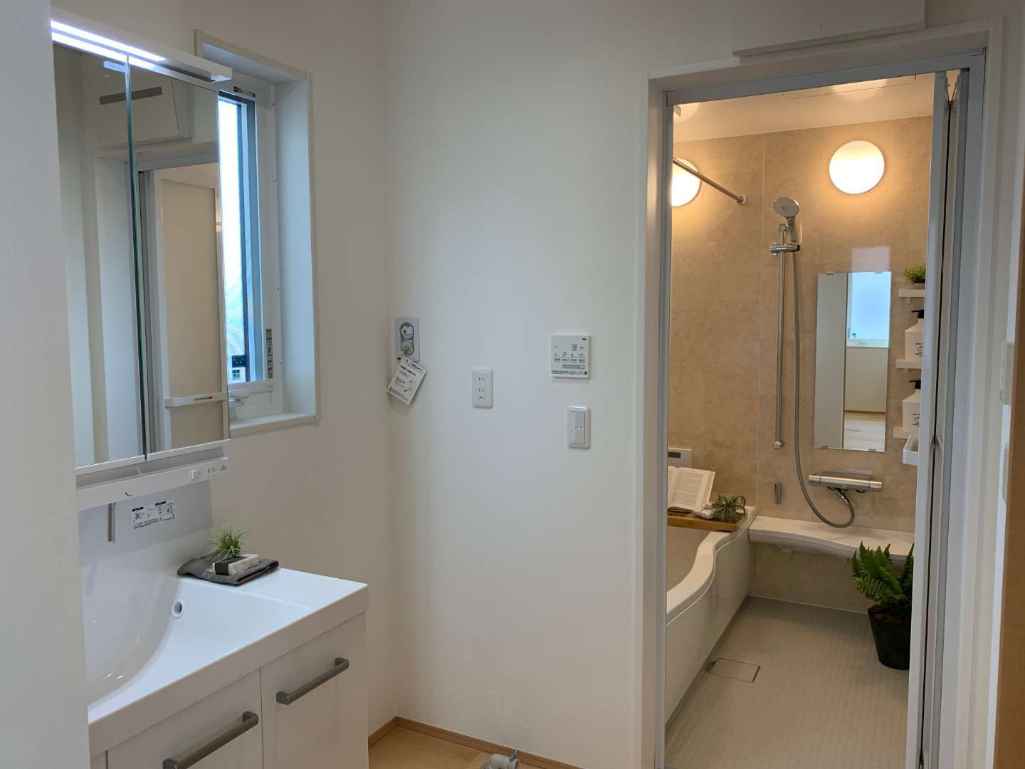 洗面室はキッチンからの動線で、家事時短になるように工夫されています。