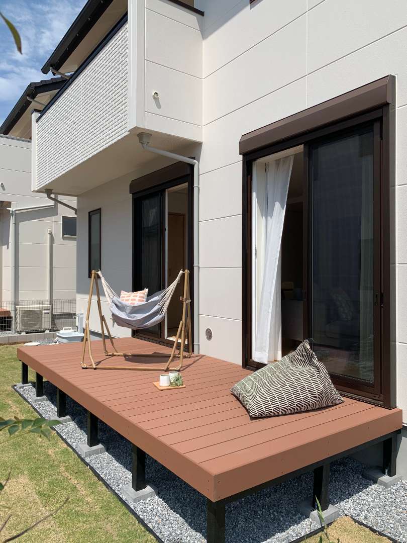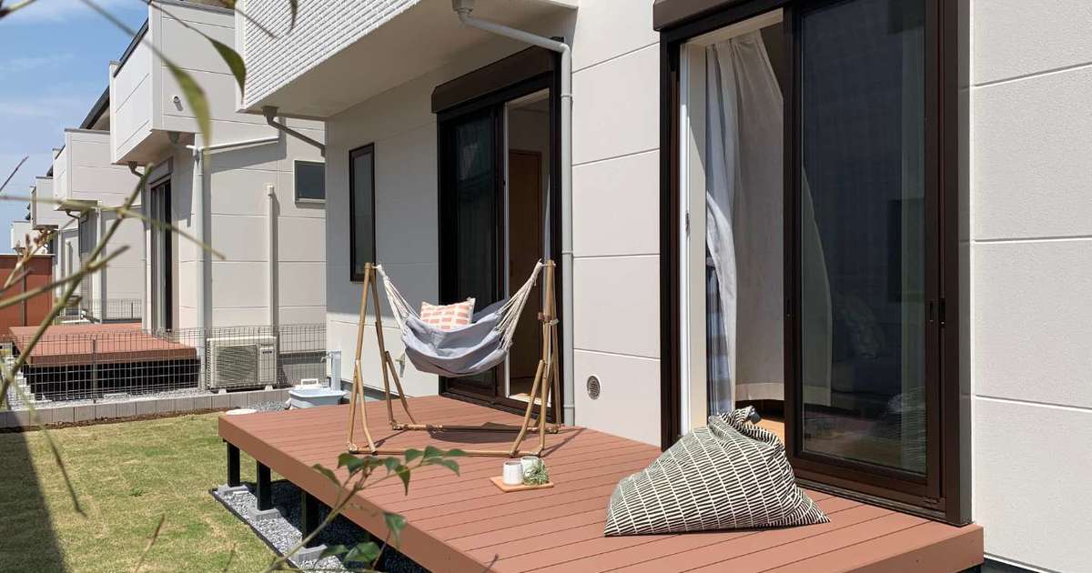 住みやすさで好評の印西市にある、大東建設が手掛けるエキシービレッジ印西牧の原~ゆかりの杜~のウッドデッキがある家では、ぽかぽか陽気の日はこんな風にハンモックとクッションを置いて、日向ぼっこはどうでしょう?