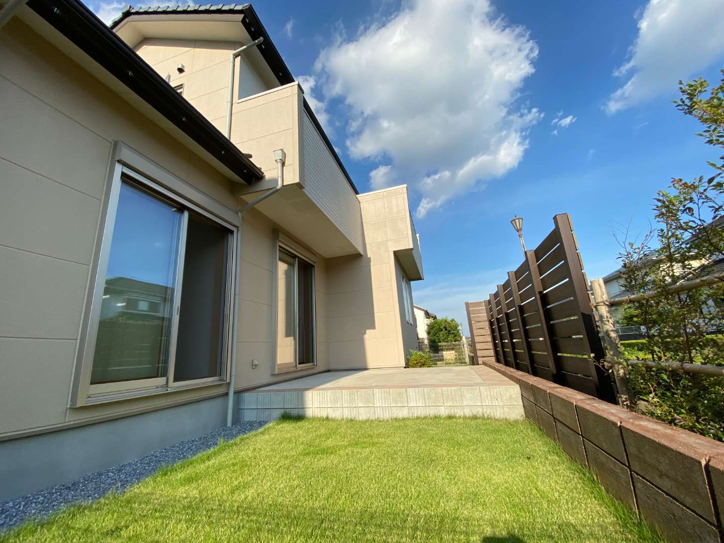 ひろ~いテラスと芝生、プライベート空間を楽しめるように程々の目隠しフェンス。