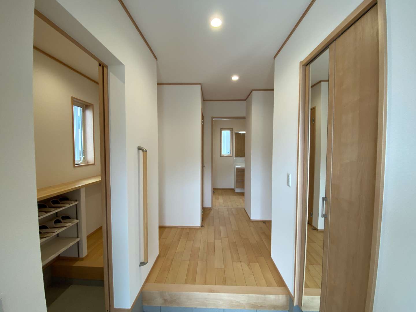 玄関ホールにはミラー扉付き土間収納とシューズインクローゼット。