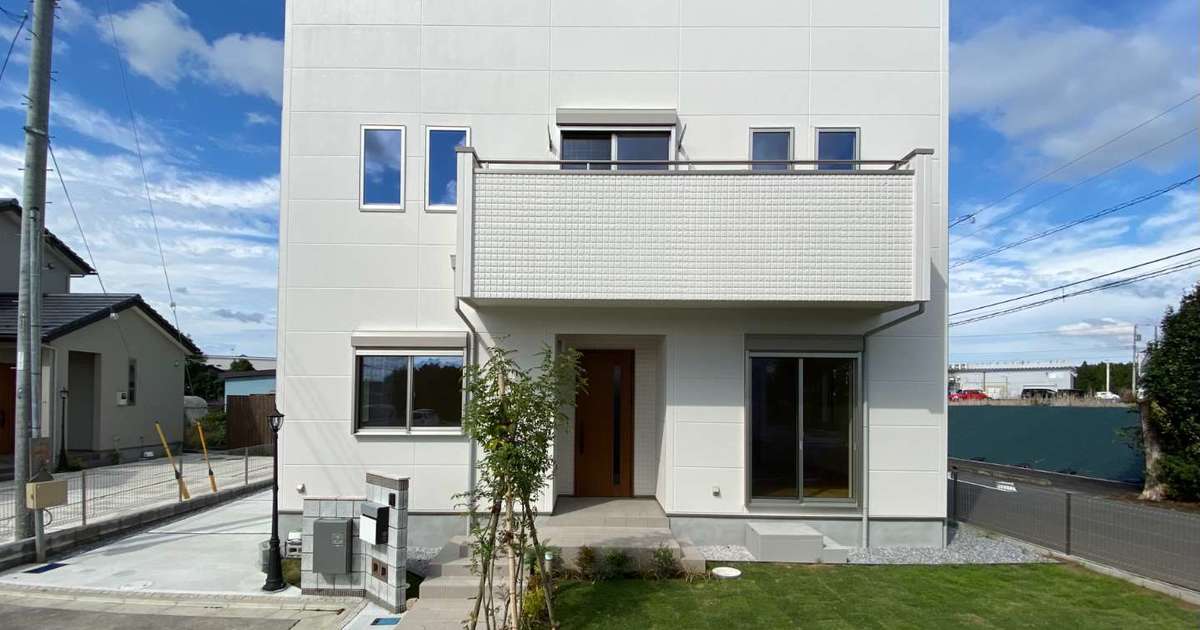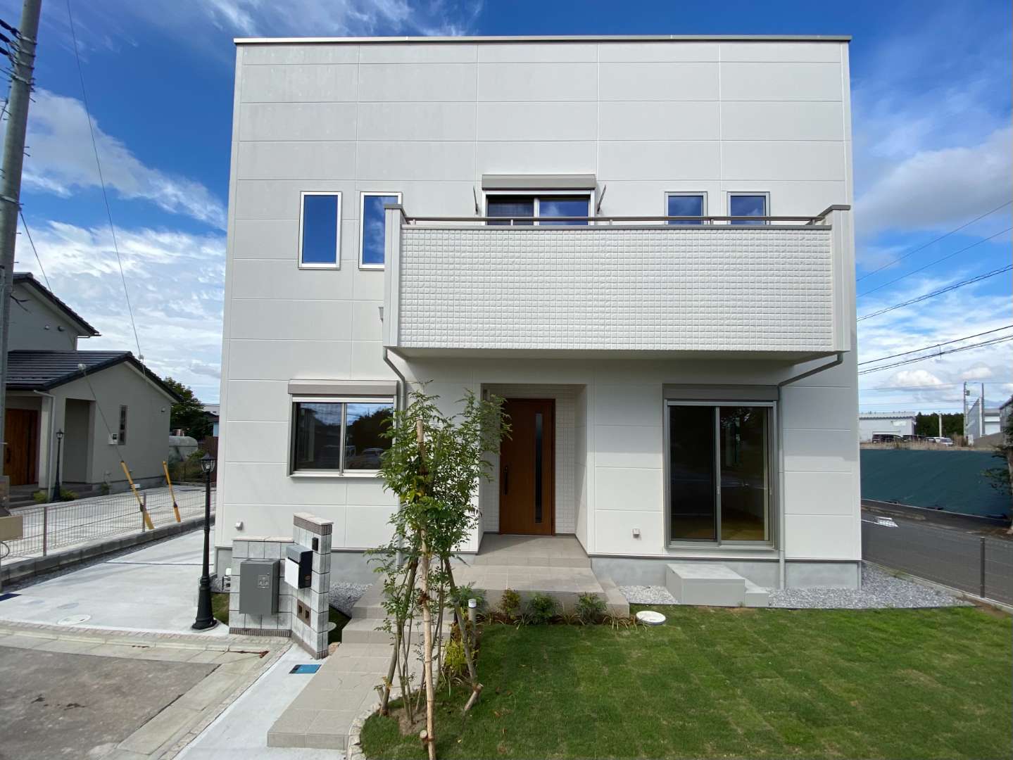 真っ白いフラットなベースにジーファスチェック75と言われるブリック状のラインと天然石をノミで削ったような暖かみのある陰影のデザインパネルをバルコニーと玄関にアクセントにしております。