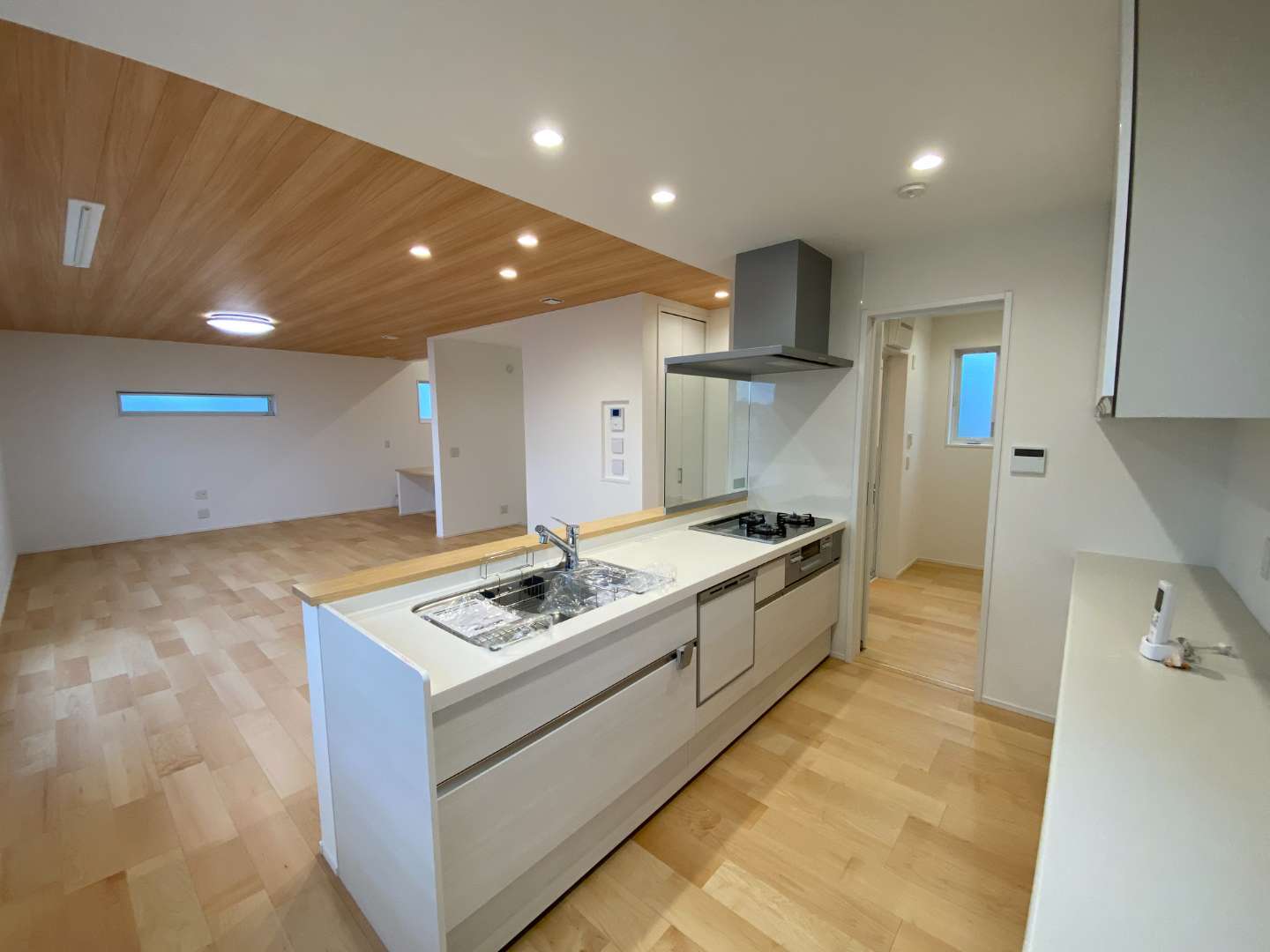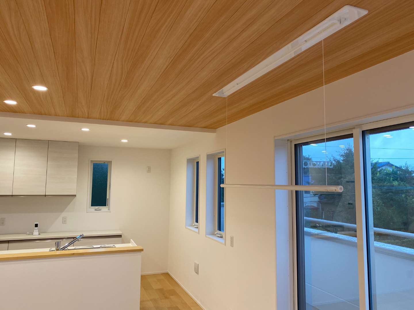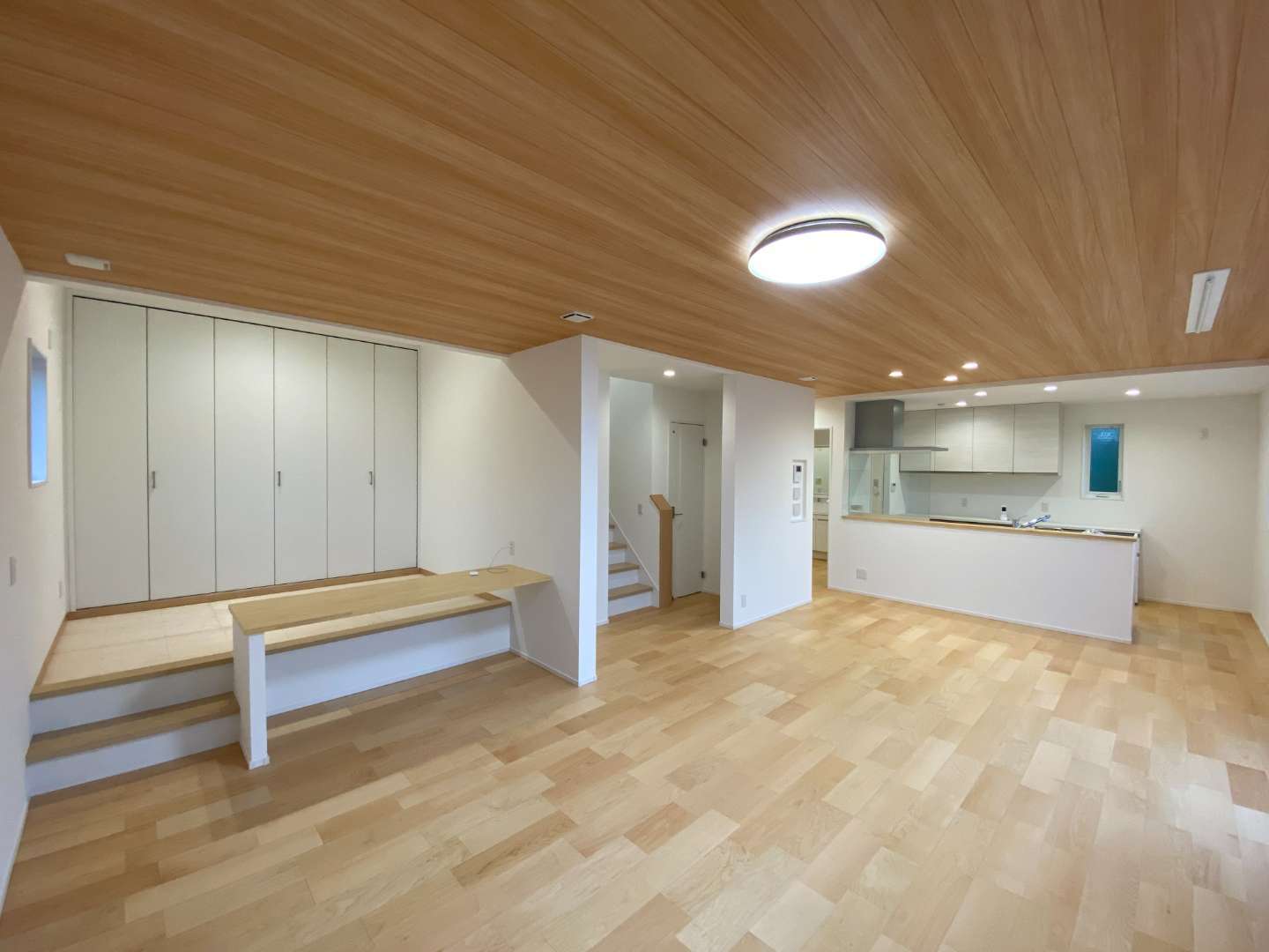 床は明るい人気のハードメープル。清潔感ある真っ白い壁やドア、アクセントとしてリビングの天井を木目にすることで、リビングの奥行き感が広がり、こちらにお住まいになられたら、お友達に自慢ができるリビングではないでしょうか?