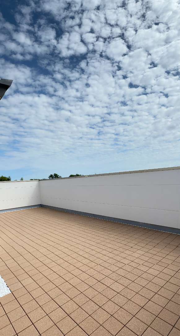 メンテナンスフリーの金属防水にデッキタイルを敷き詰めてます。