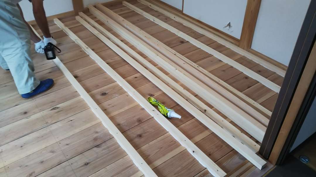 畳を上げて、根太を取付。