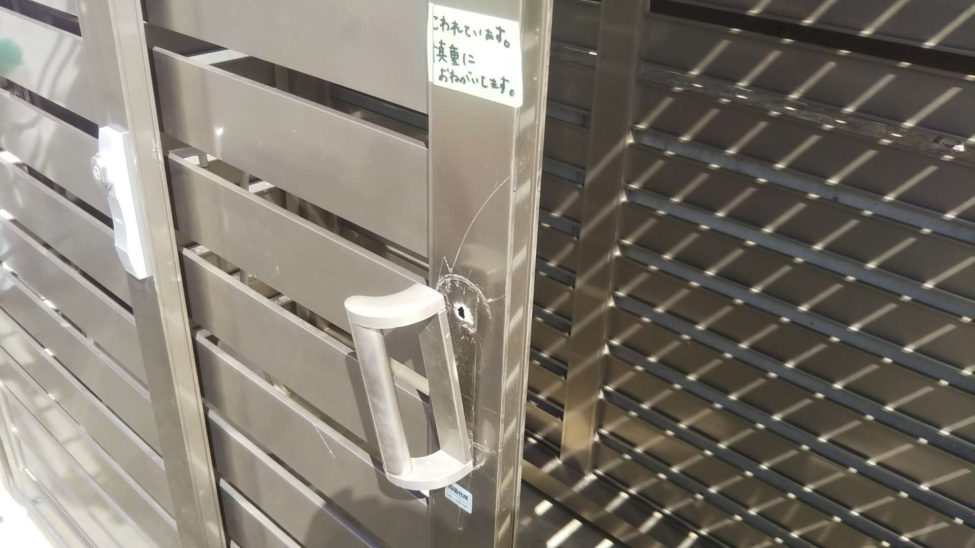 連絡を頂き見に行くと補修してありました、ゴムの紐を外してみるとこの通り完全に取れています、下のネジもぎりぎり引っ掛かっている感じです。