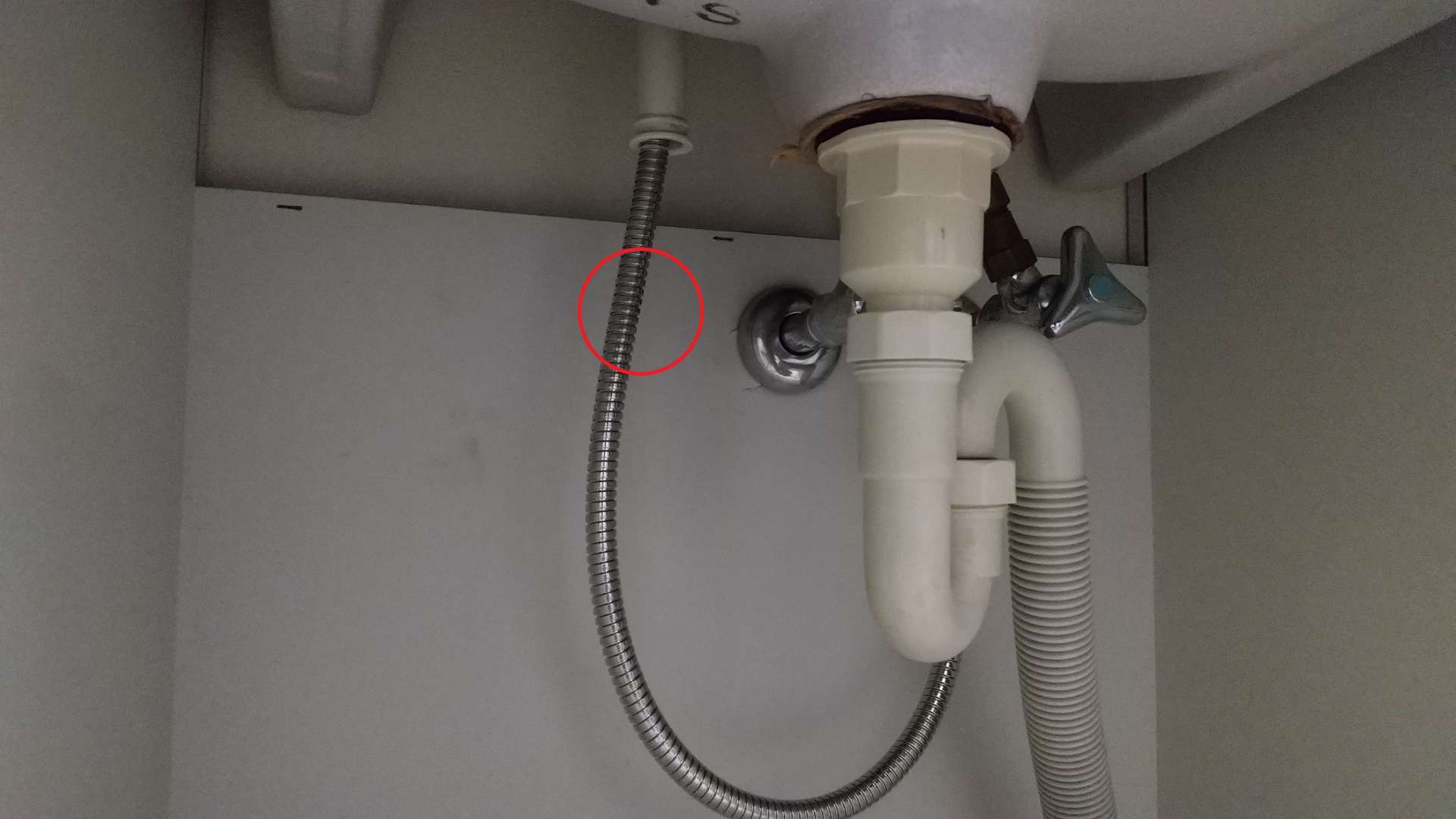洗面台下部収納庫内にて、ジャバラホースからの水漏れです。