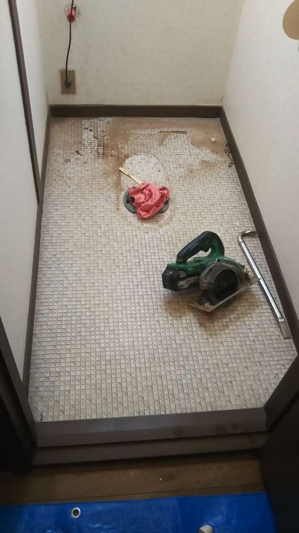 床下の確認と排水管位置を調整しますので、床あけます。