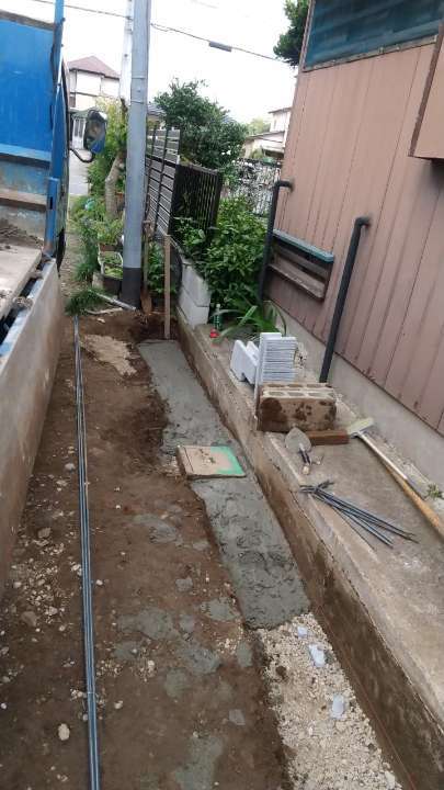 植栽等撤去、土砂取り、ベース、ブロック積。