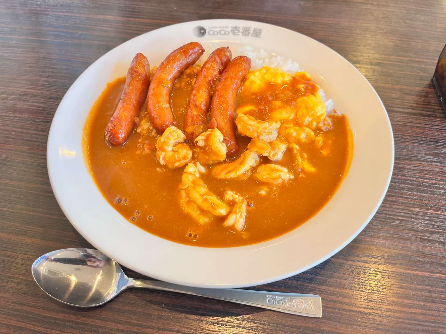 久々だったんでエビカレーにスクランブルエッグとソーセージ4本とトッピング多めに奮発しました!