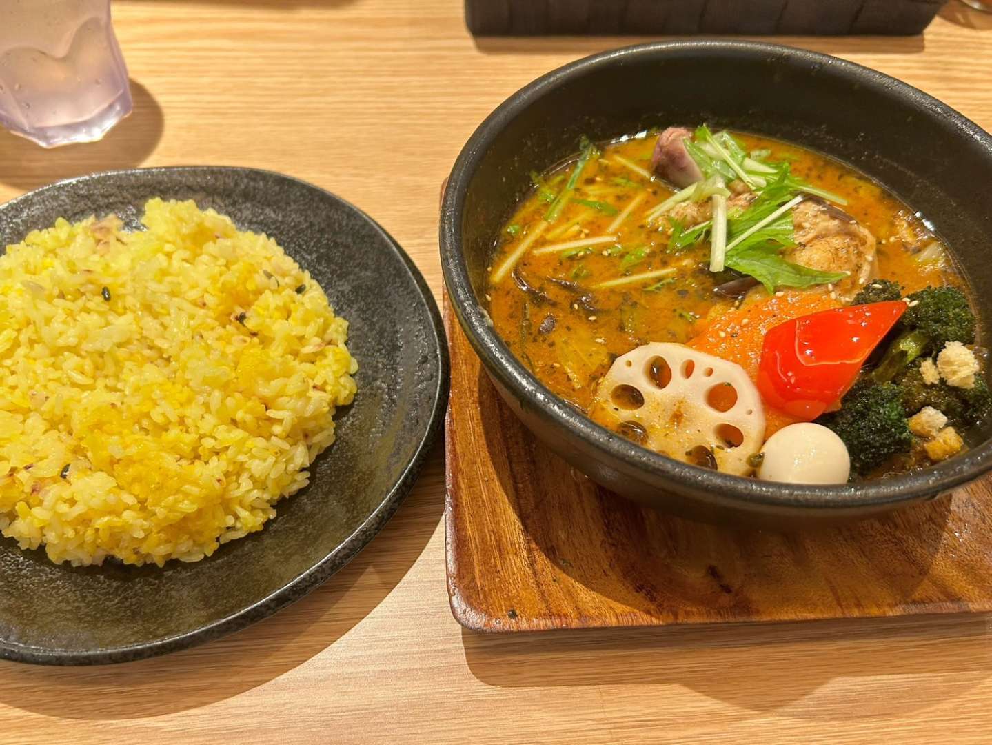 沢山の野菜と大きい骨付きチキンが入っていてボリューム満点で和風のだしの味とスパイス?がすごくおいしくて定期的に食べたくなる味!!
