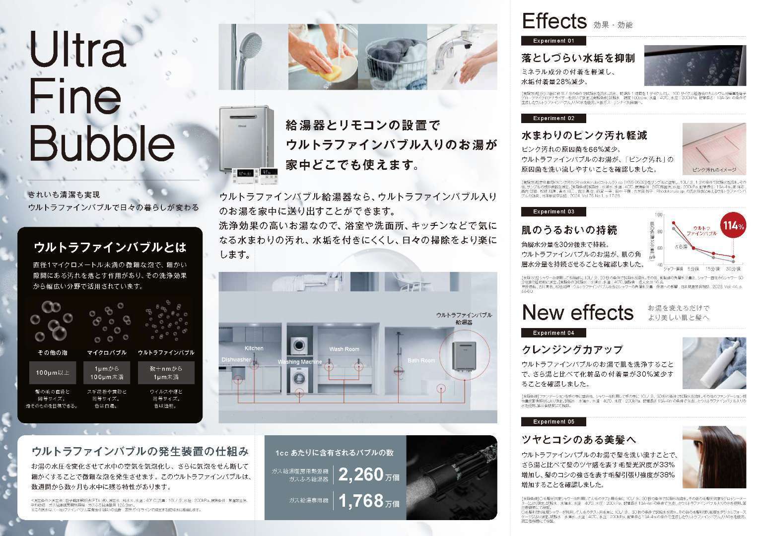 給湯器からウルトラファインバブルを届けてくれるので普通のシャワーヘッドでもそこからウルトラファインバブルが出てくる&キッチンや洗面等、給湯器を通して供給されるお水・お湯からウルトラファインバブルが出てくるということに感動しました。