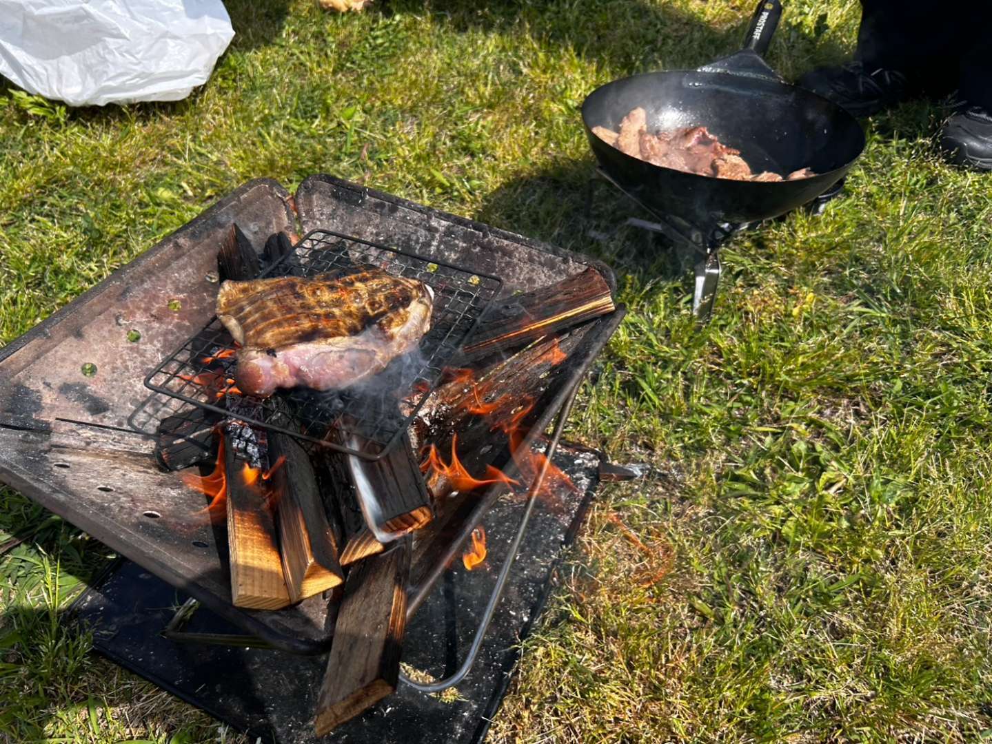 唯一燻製器用の小さい網があったので、焚火で肉を焼くことが出来ました。