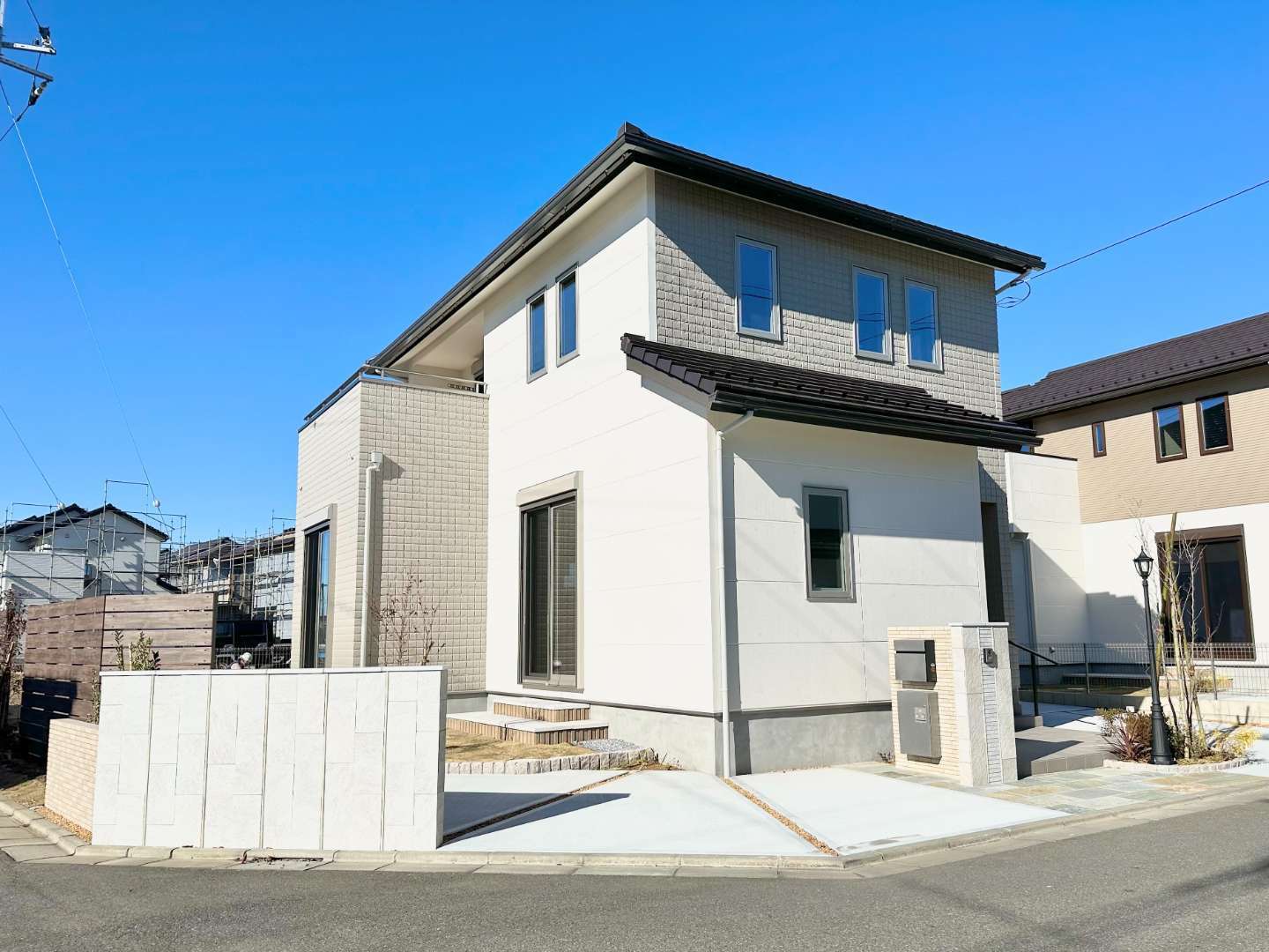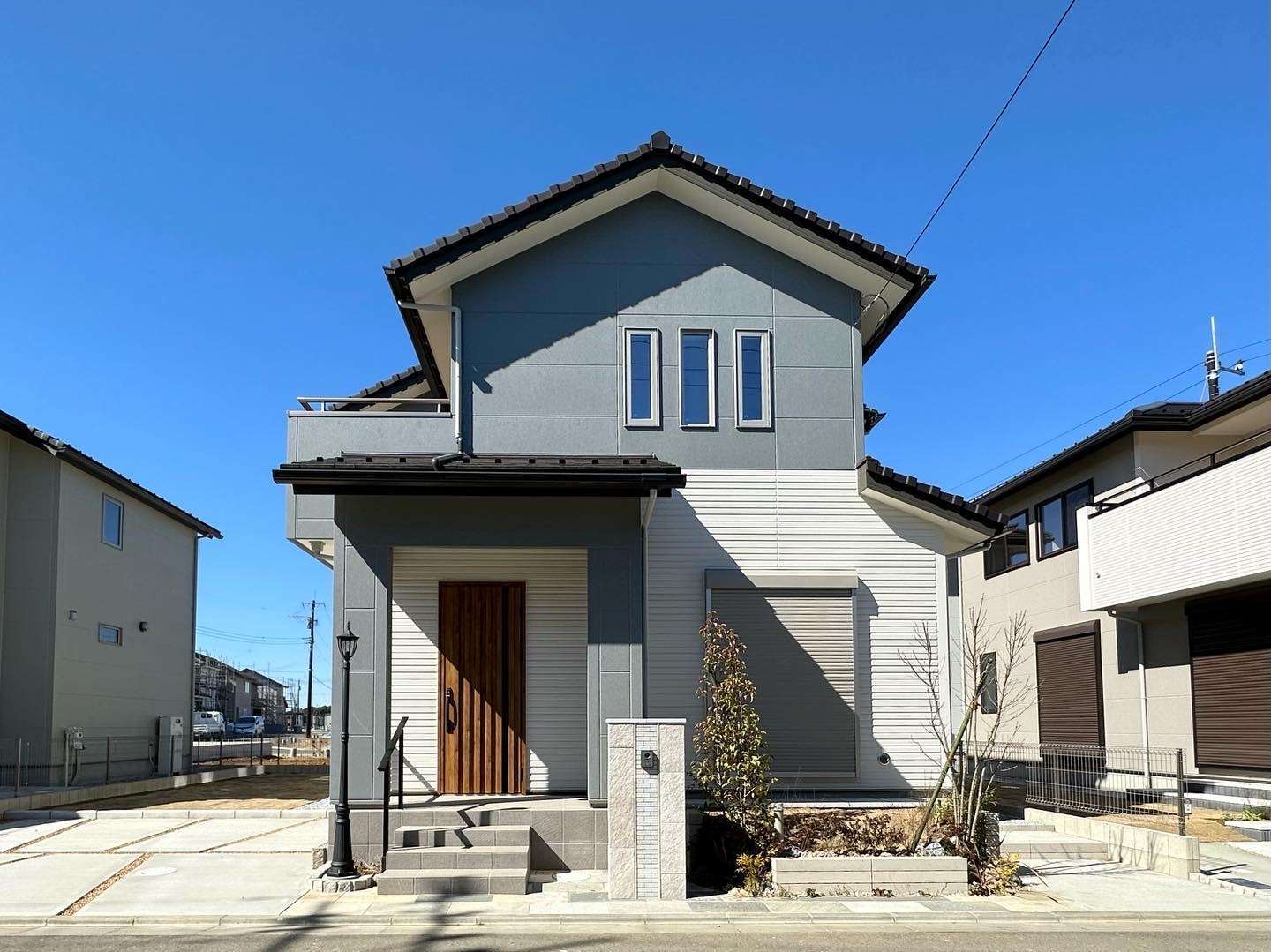 【美しい建物外観の秘訣・その1。鮮やかなホワイトを基調としつつ、アクセントカラーを使った外観。屋根瓦はこだわりの三州瓦】