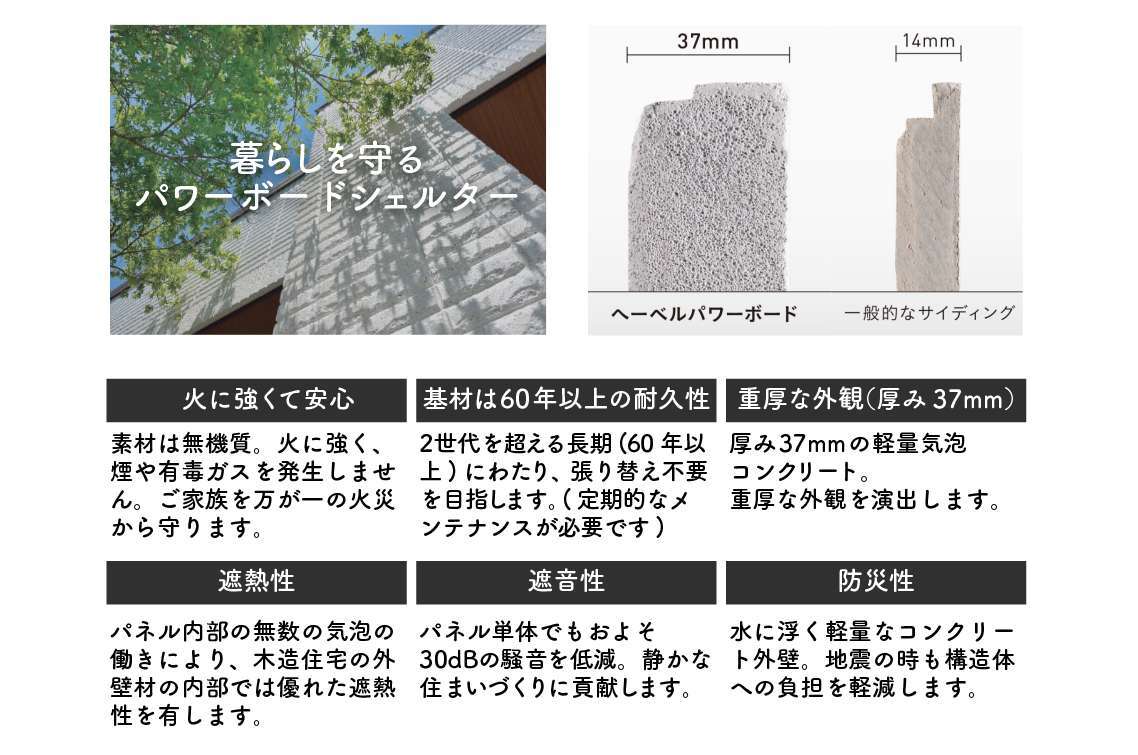 住まい選びにおいて大切なことの一つが、維持費のこと。定期的なメンテナンスは、永く住まうために大切な要素です。でも、できることなら回数を少なく済ませたいというのが本音です。当社施工の住戸は、長期に渡り高い耐久性を誇る素材を採用し、メンテナンスコストも考えた家づくりを目指しています。例えば、外壁材には防火性・防災性・耐久性に加え、断熱性や遮音性を追求した旭化成製「ヘーベルパワーボード」を採用。そして外壁に使用する塗装剤には、期待耐用年数25年〜30年の旭化成製「イベリアン」を使用し、外壁の保護と共に塗り替えサイクルの長期化も実現しています。こだわりの素材で美しさと耐久性、そしてメンテナンスコストの抑制も大切にしています。