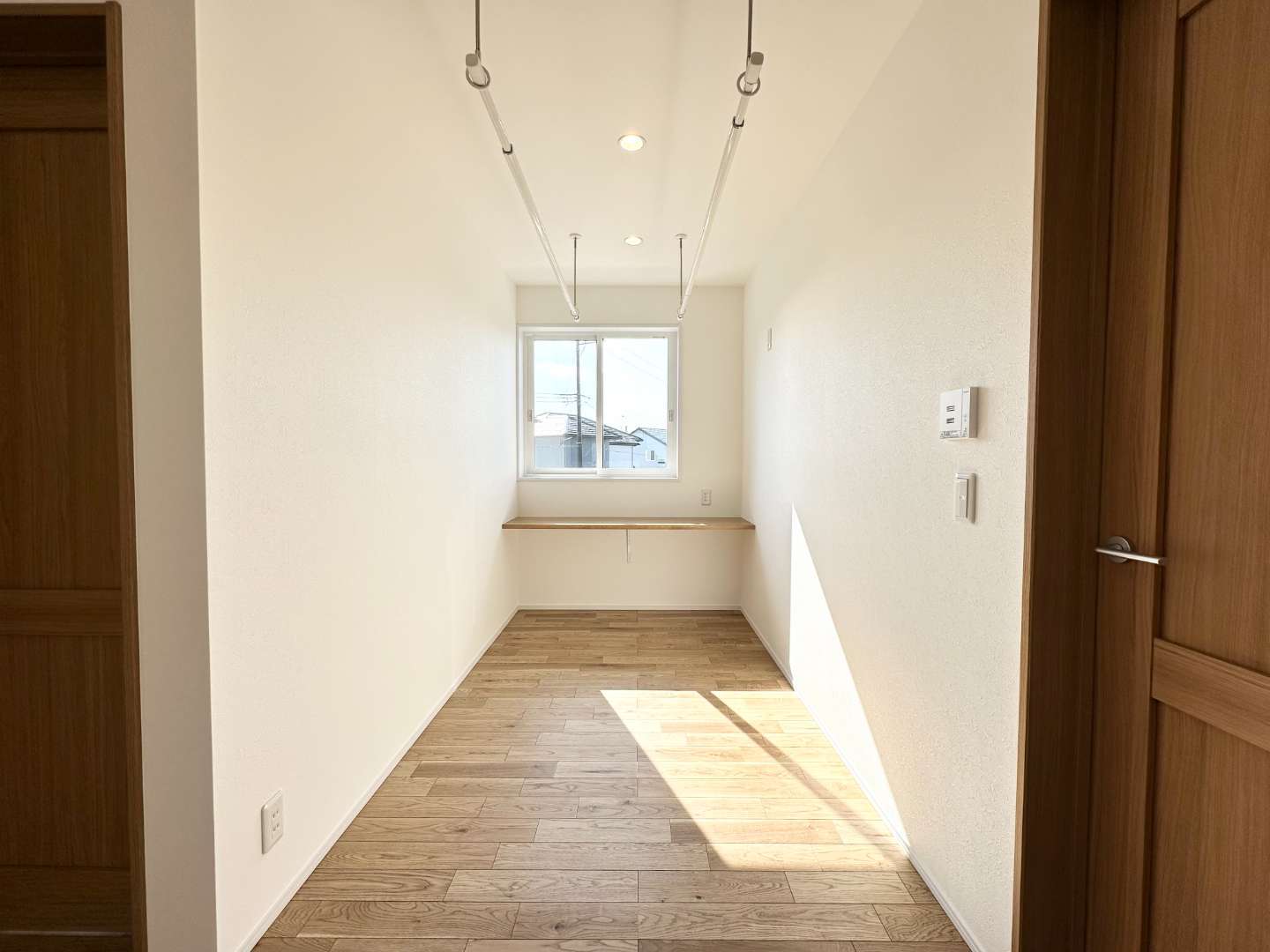 当社では、1階に家事室、2階にホールを設けた住戸もあり、そのスペースを室内干しに活かせるよう、川口技研製「ホスクリーン」を設置しています。