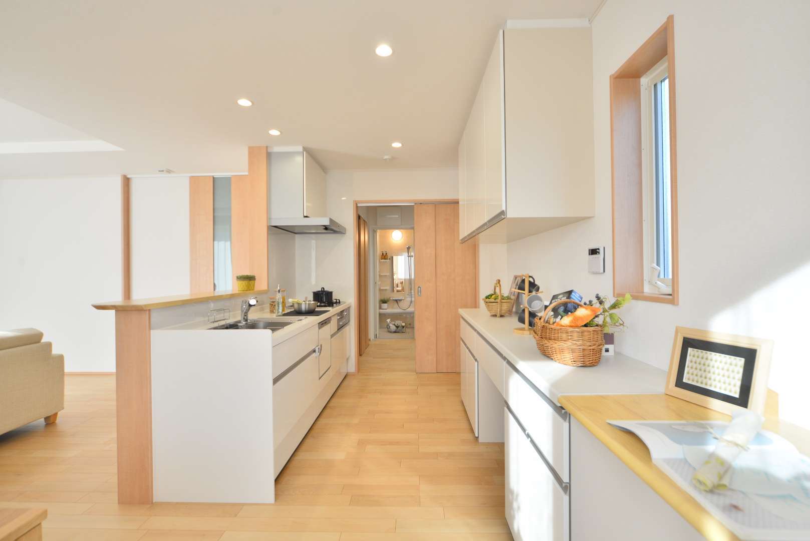 キッチン、洗面室、お風呂まで一直線!人気の家事動線プランに加えて、リビング・ダイニングは当然のことながら、キッチンにも床暖房が採用されております。是非体感してください!