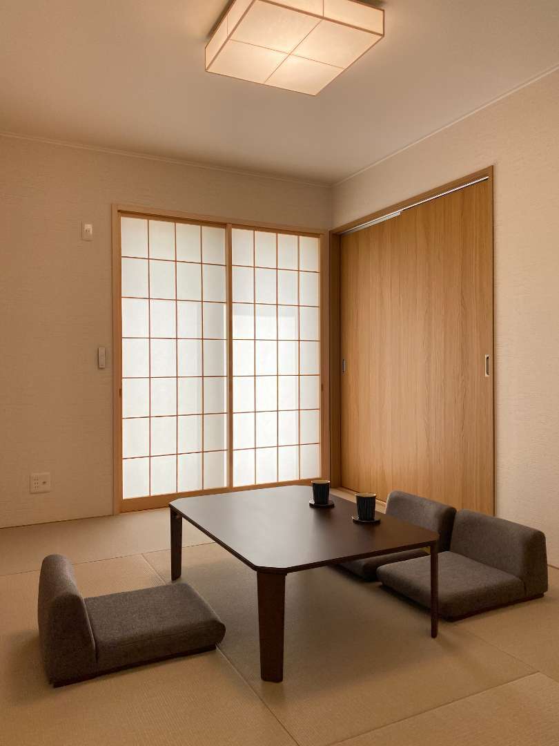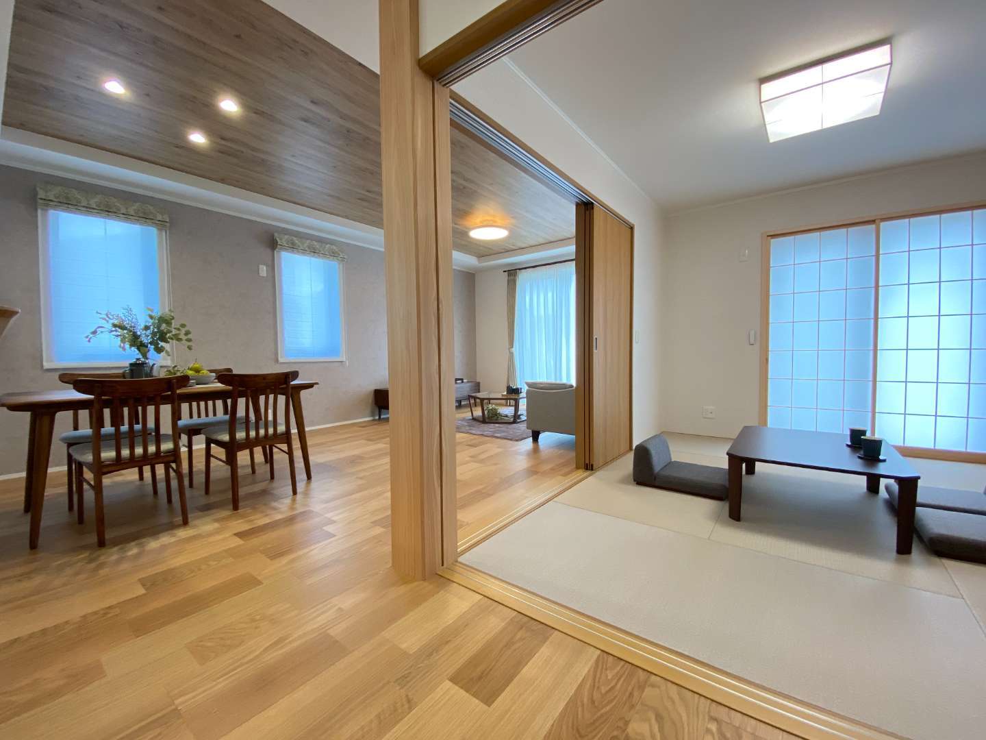 210ミリの太さがある檜無垢大黒柱を中心とした引き戸をオープンにすると、カラー畳のおしゃれな和室が広がります。