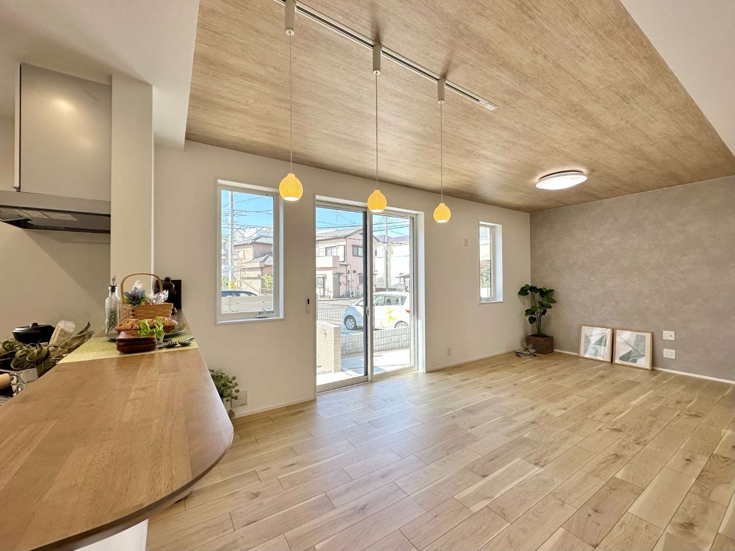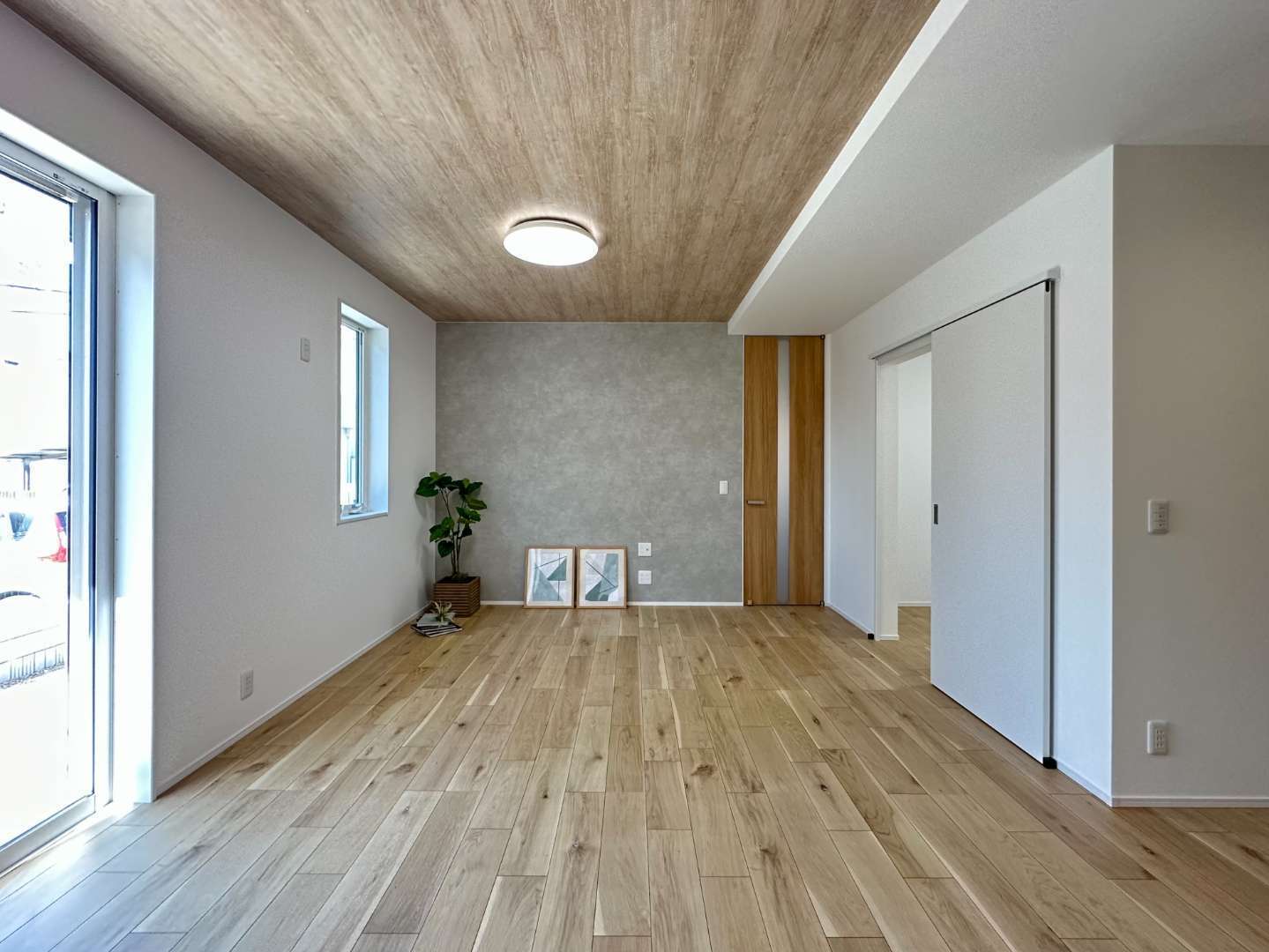 LDKはフローリングや天井の木目とアクセントクロスを活かした、温かみのあるデザインが魅力です。