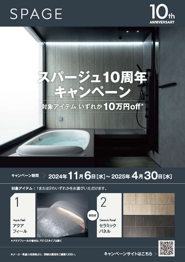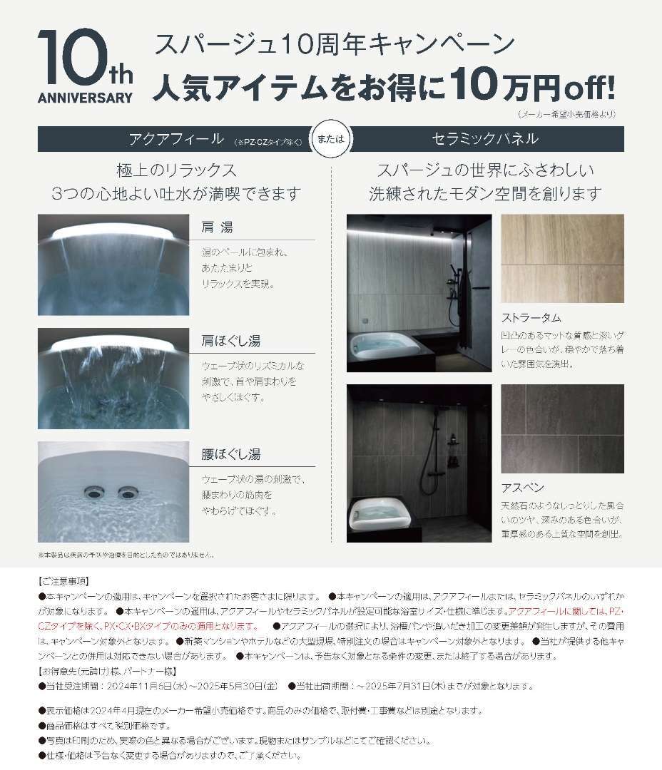キャンペーンにお申し込みいただき、LIXIL『スパージュ』で浴室入替工事をしていただくと、「アクアフィール」または「セラミックパネル」がメーカー希望小売価格より10万円OFF でご購入いただけます。