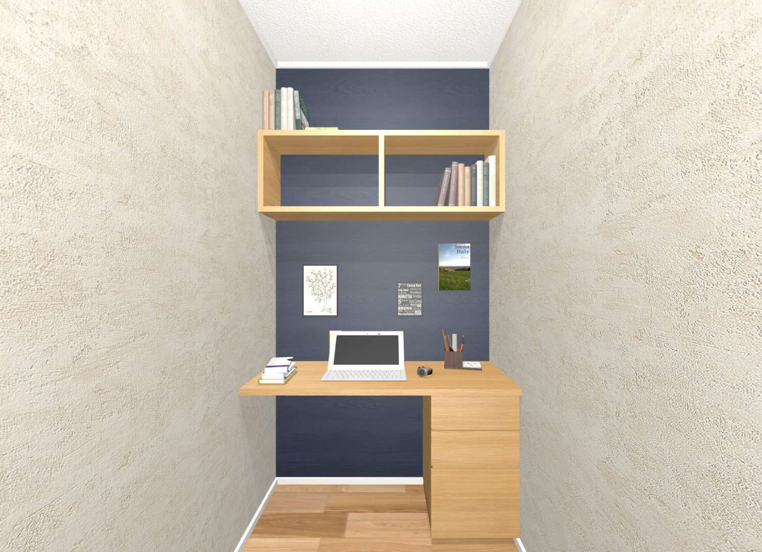 こちらの物件は、造り付けのデスクと引出し付です。正面のブルーの壁は、パナソニックのマグネットボードを使用しています。スケジュールや思い出の写真など、何でも貼っていただけます♪