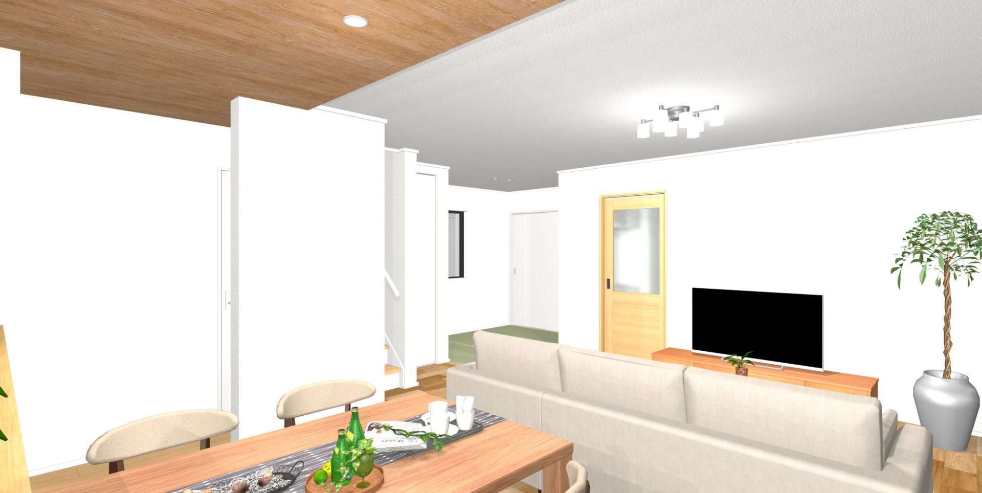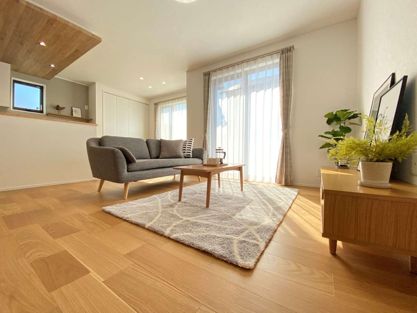 床はオーク、サッシ内観色はブラック。下がり天井には木目柄でカッコよく
