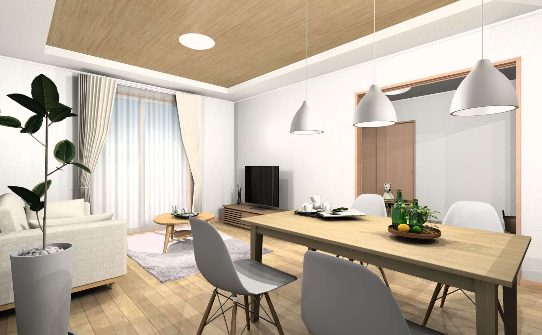 上の写真が現在の様子。すでに家具も入っていますが、これから壁紙とダイニング照明のリニューアル工事を行います。