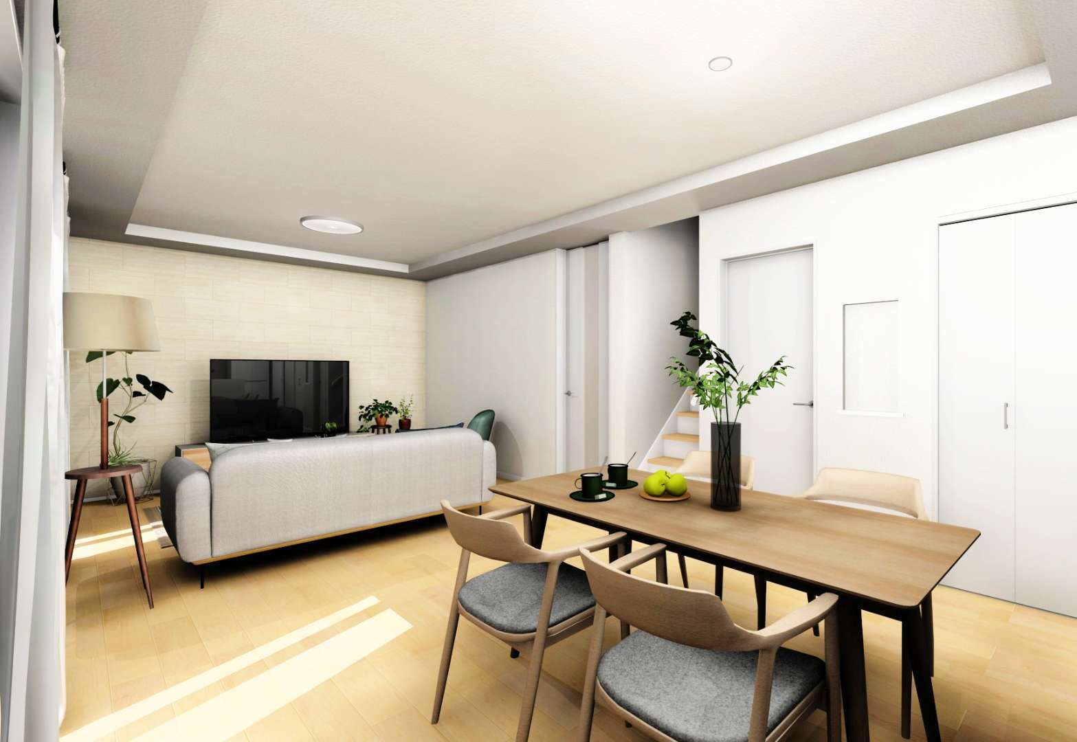 TV背面は、タイル調のアクセントクロス。大きなテレビも置けますよ(#^.^#)