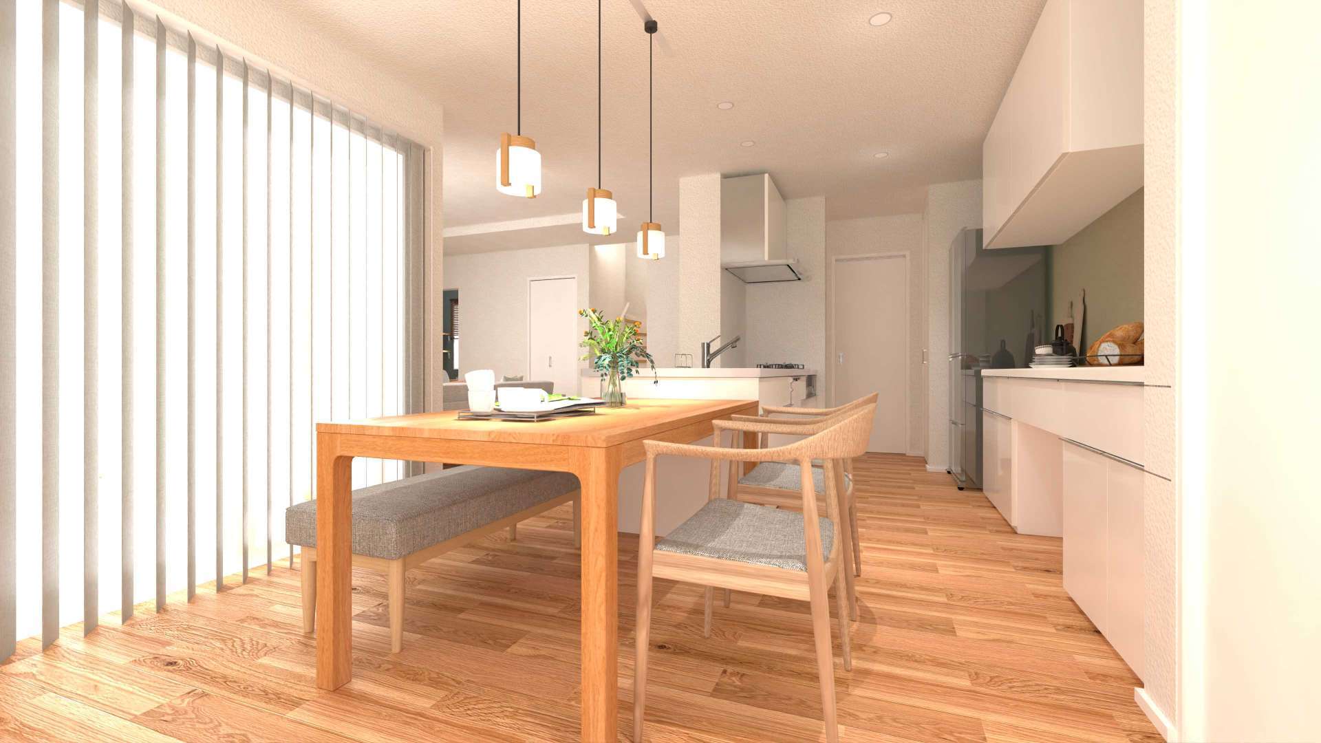 掃き出し窓から明るい日差しが差し込むダイニングと収納たっぷりのキッチンスペース♪洗面所への同線もスムーズです。
