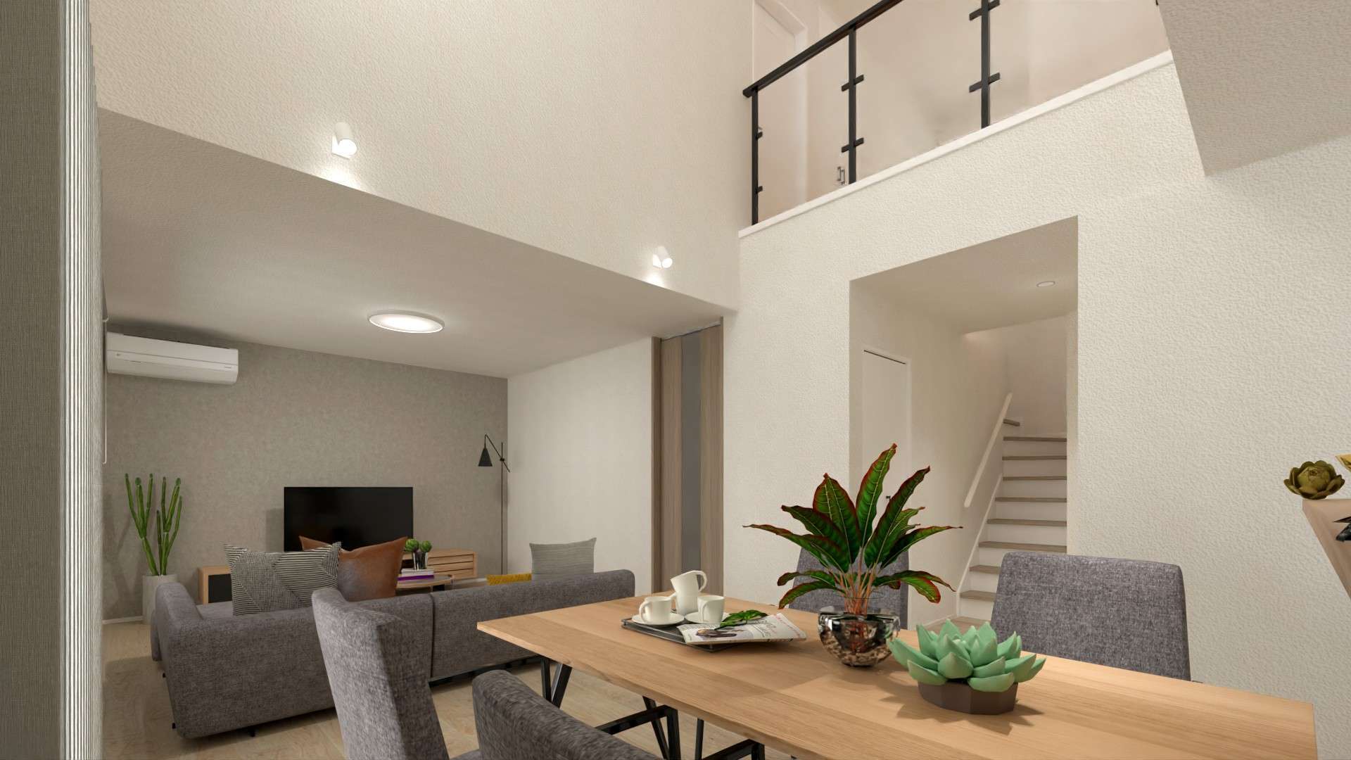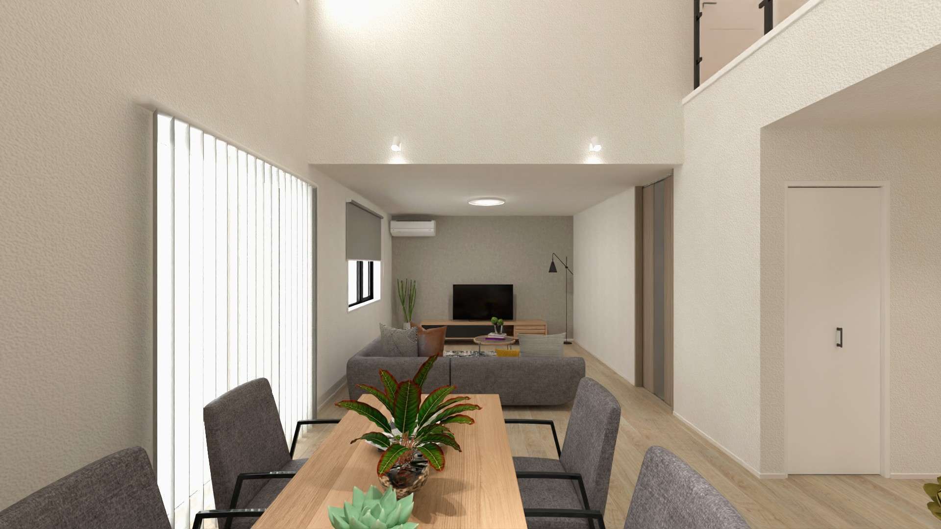 ダイニング上の吹き抜け手すりは、開放感のあるパネルタイプを採用!奥行きが出て、空間に広がりが感じられます。