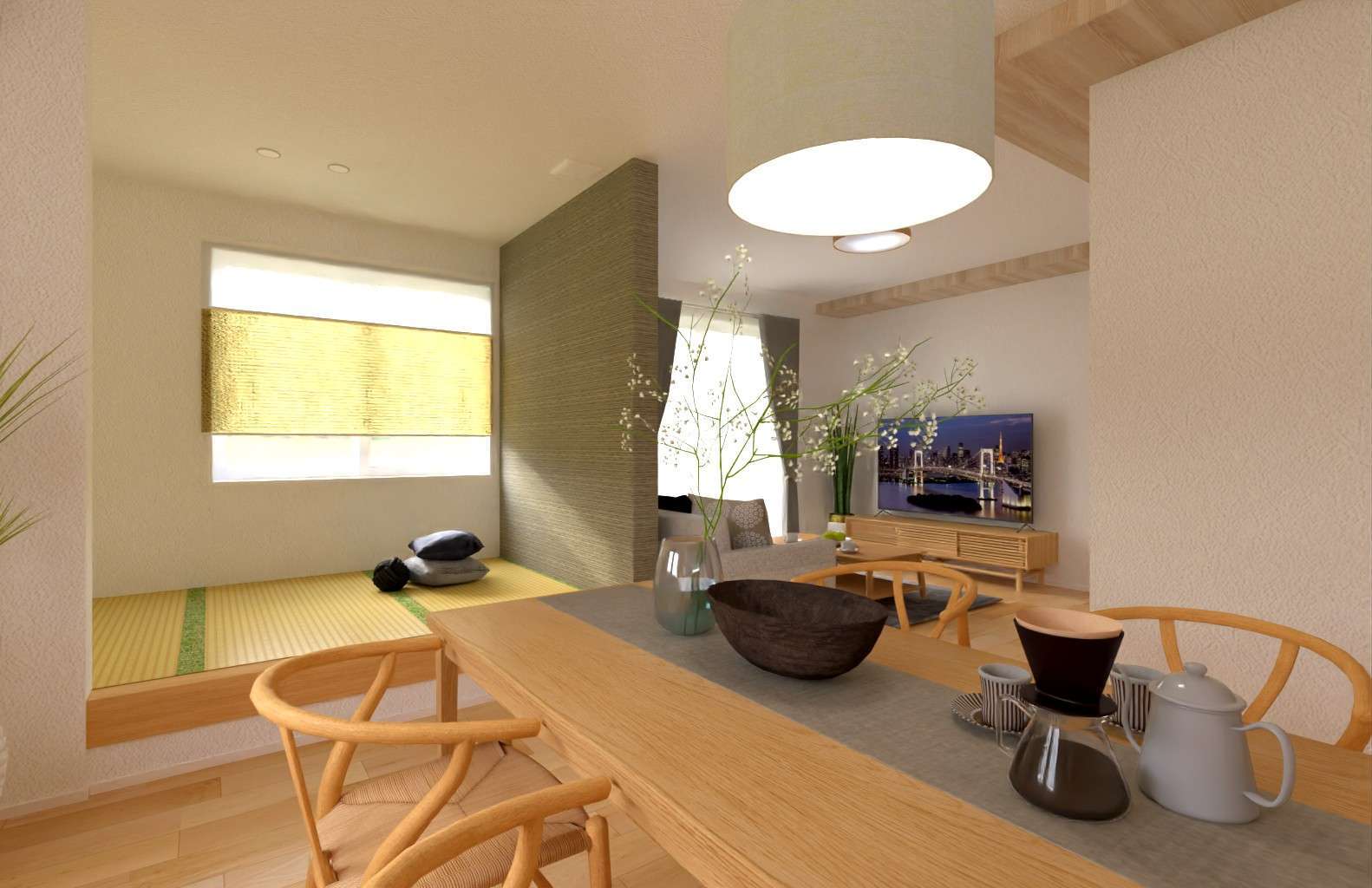 リビングと畳コーナーを区切る、グリーンのアクセントクロスが和の雰囲気を演出しています♪