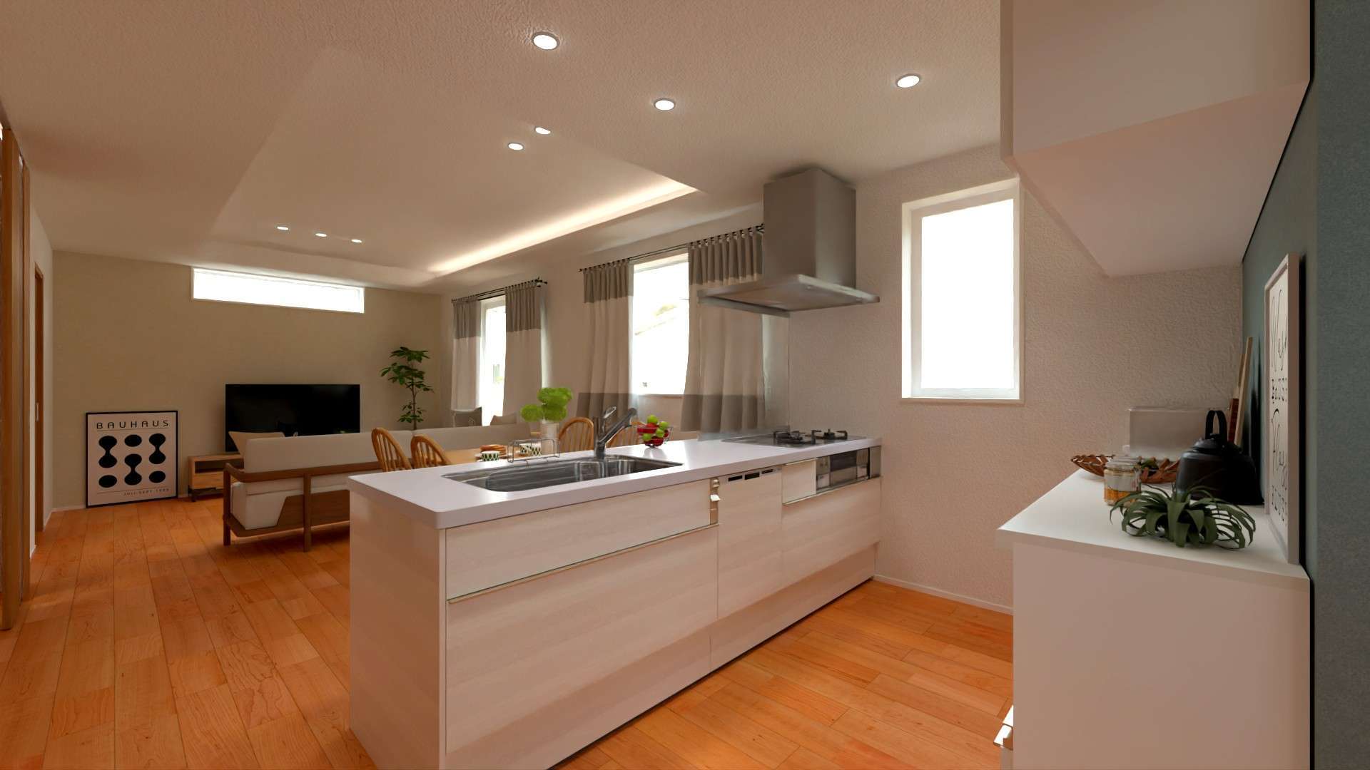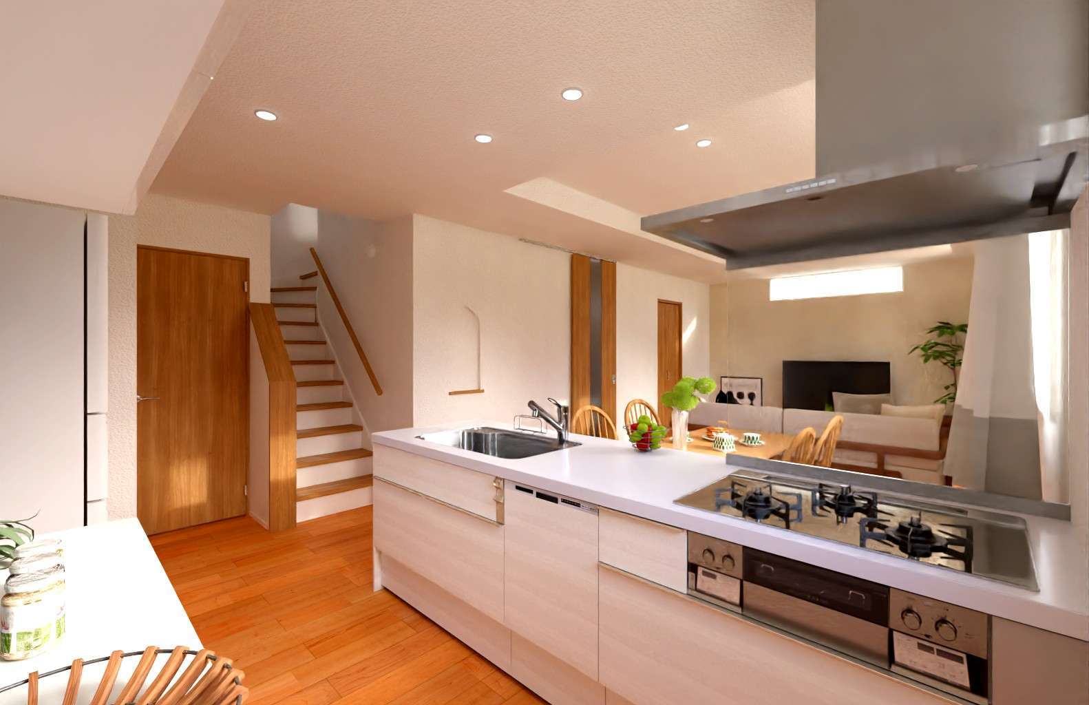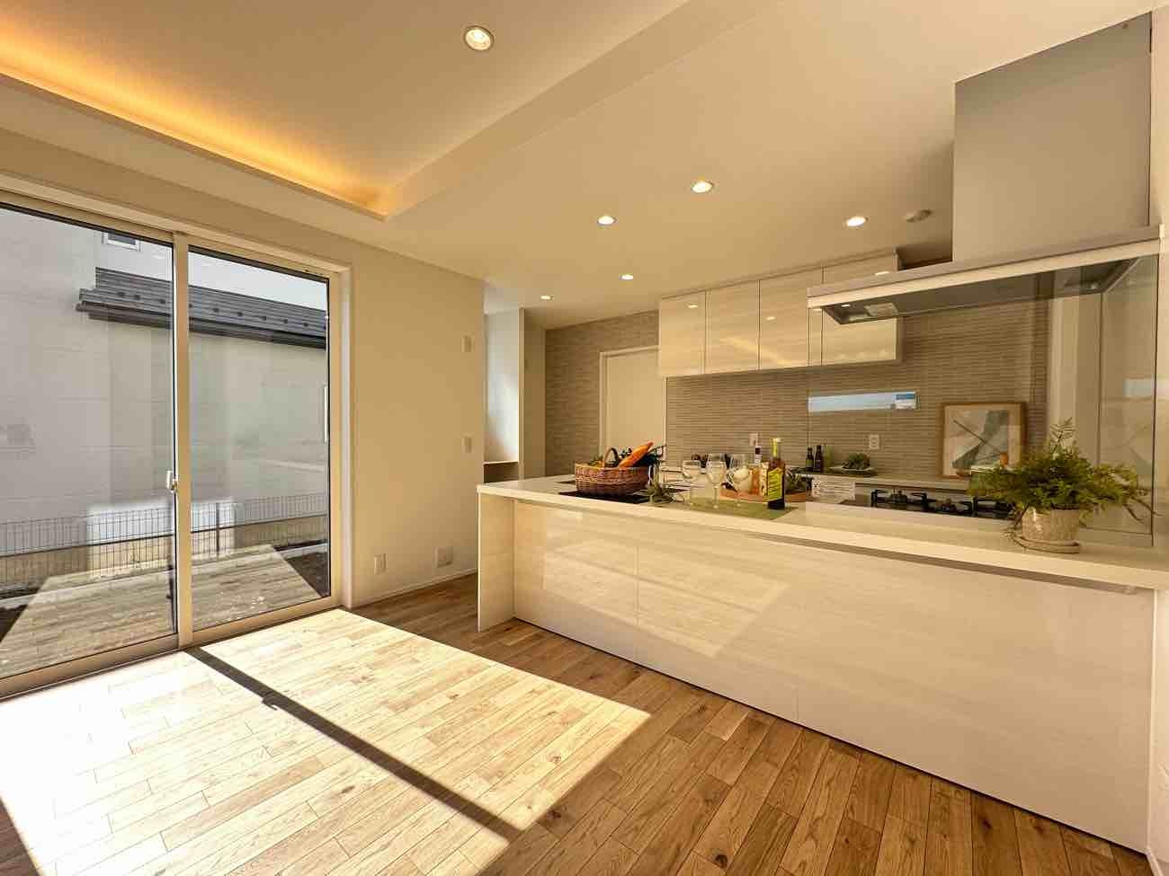 ペニンシュラキッチンで、調理中もリビングの見通しがいいですよ♪インターホンニッチのデザインも三角にしています(^^♪