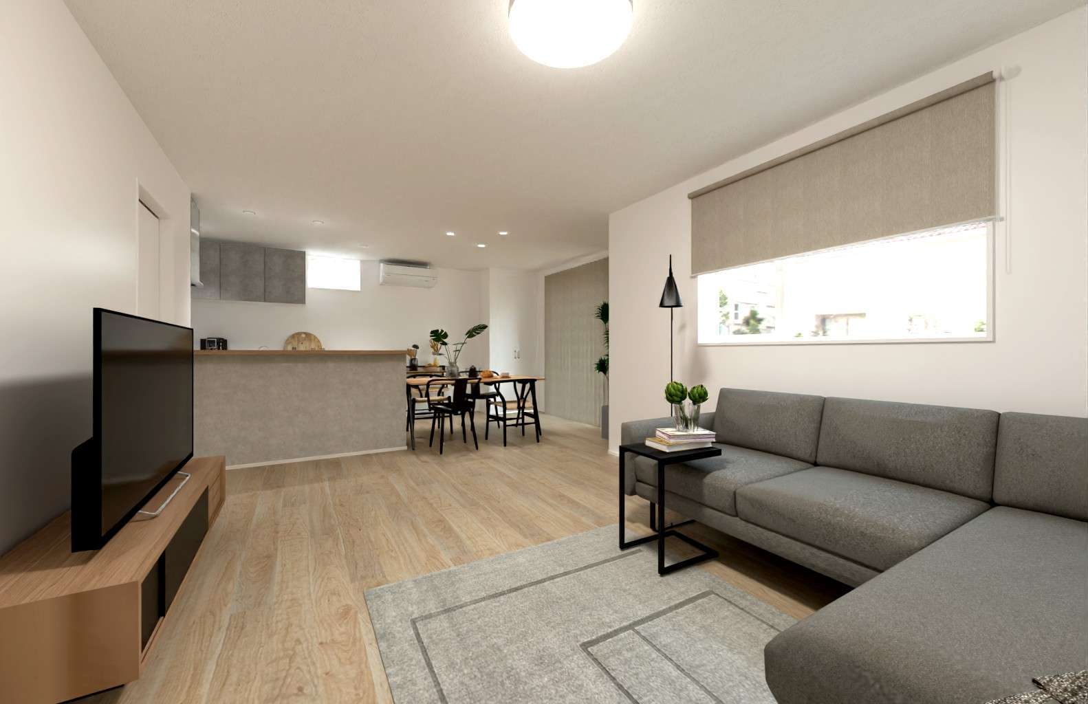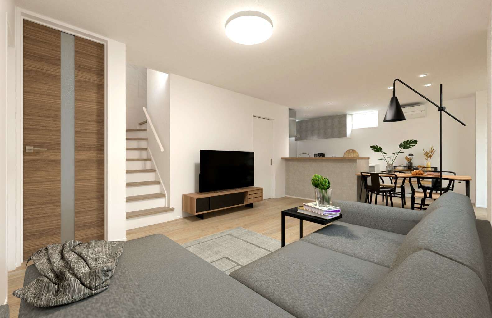 床や建具、キッチンをグレートーンでまとめた「グレイッシュモダンスタイル」のお家です。フレームや脚にブラックを使った家具とも相性がよく、洗練された雰囲気を演出してくれます。LDKは広々とした20帖の空間。L字型のソファーを置いても、ゆったりとくつろげる十分なスペースがあります。