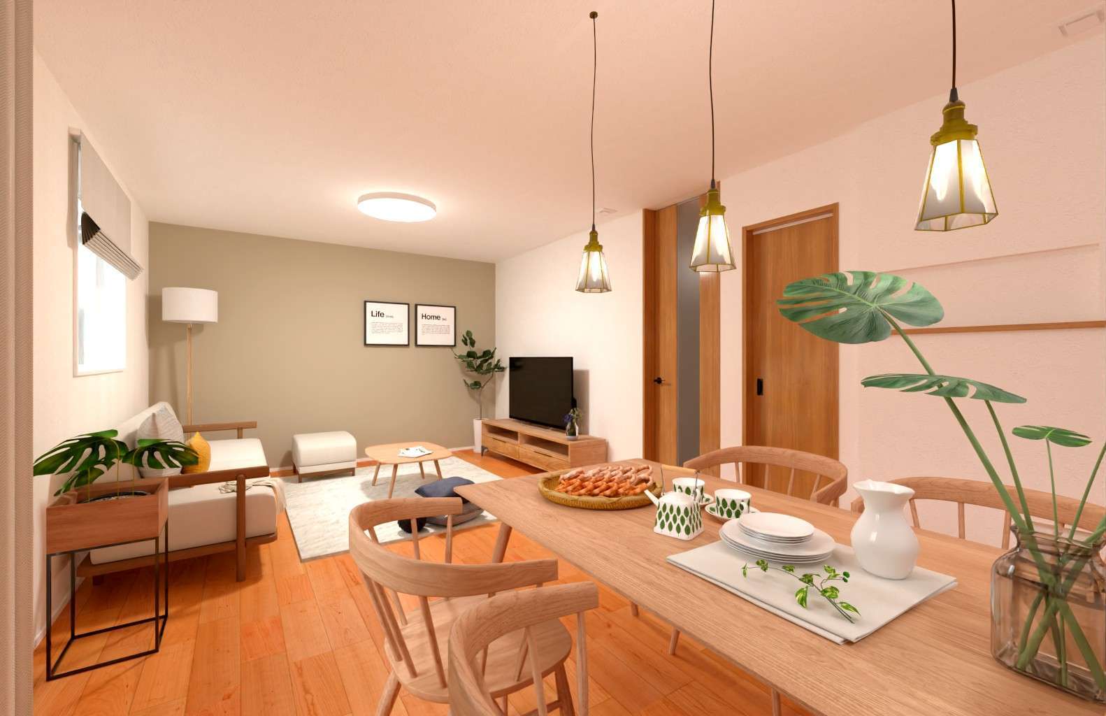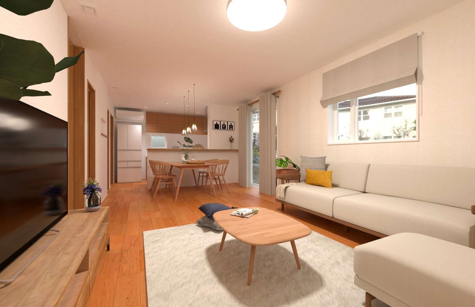 床はあたたかみのあるブラックチェリーを使用し、建具も同色でコーディネートしました。やさしい色味が空間を包み込み、ほっとくつろげるリビングになっています。