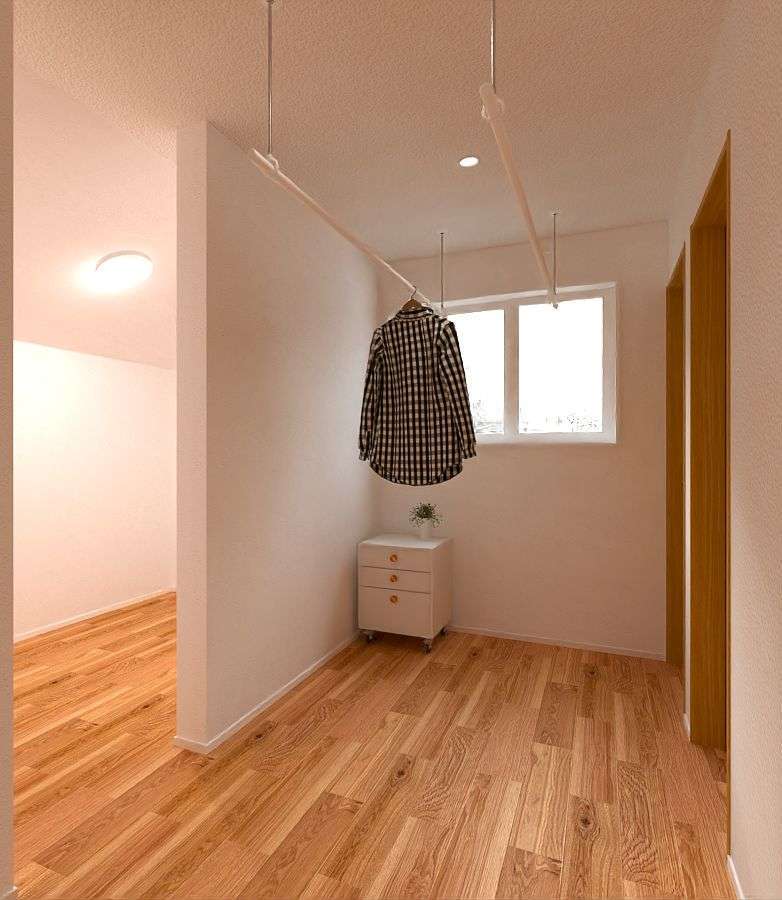 2階ホールには室内干しスペースも完備。引き違いの窓があるので、湿気がこもりにくく、快適にお使いいただけます。さらに左側には3帖のフリースペースも♪収納として使ったり、お子様の遊び場やワークスペースとしてもお使いいただけます。
