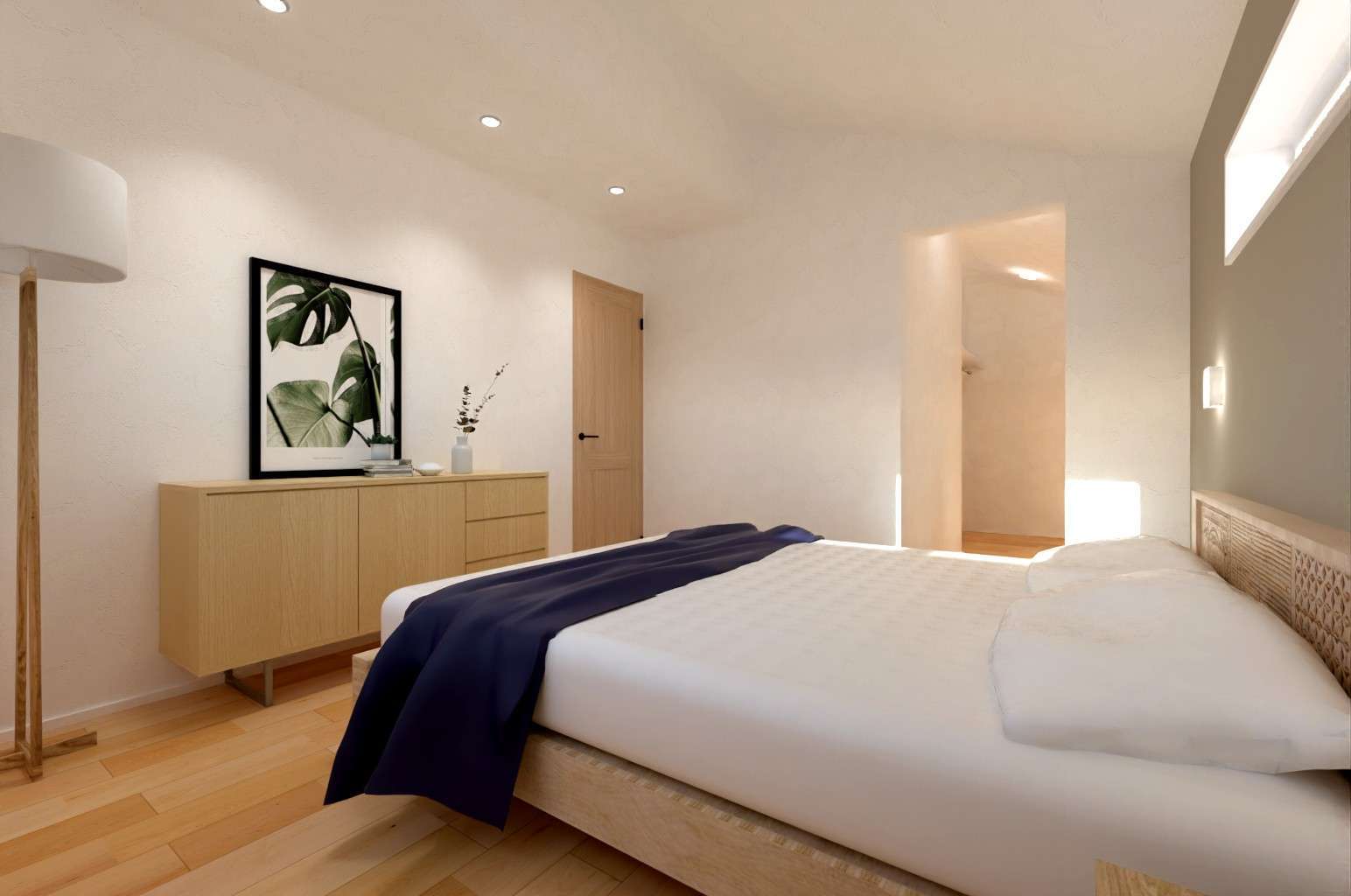主寝室は、勾配天井で開放感たっぷり!奥には約4帖のウォークインクローゼットがあり、使いやすい工夫がぎゅっと詰まっています。