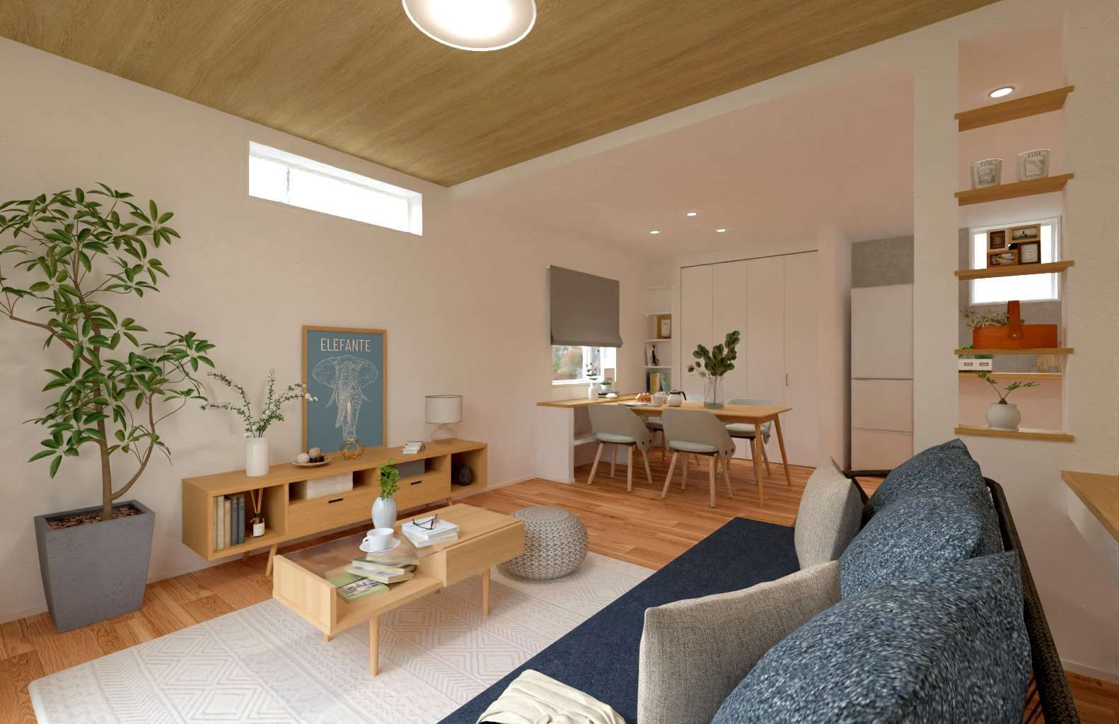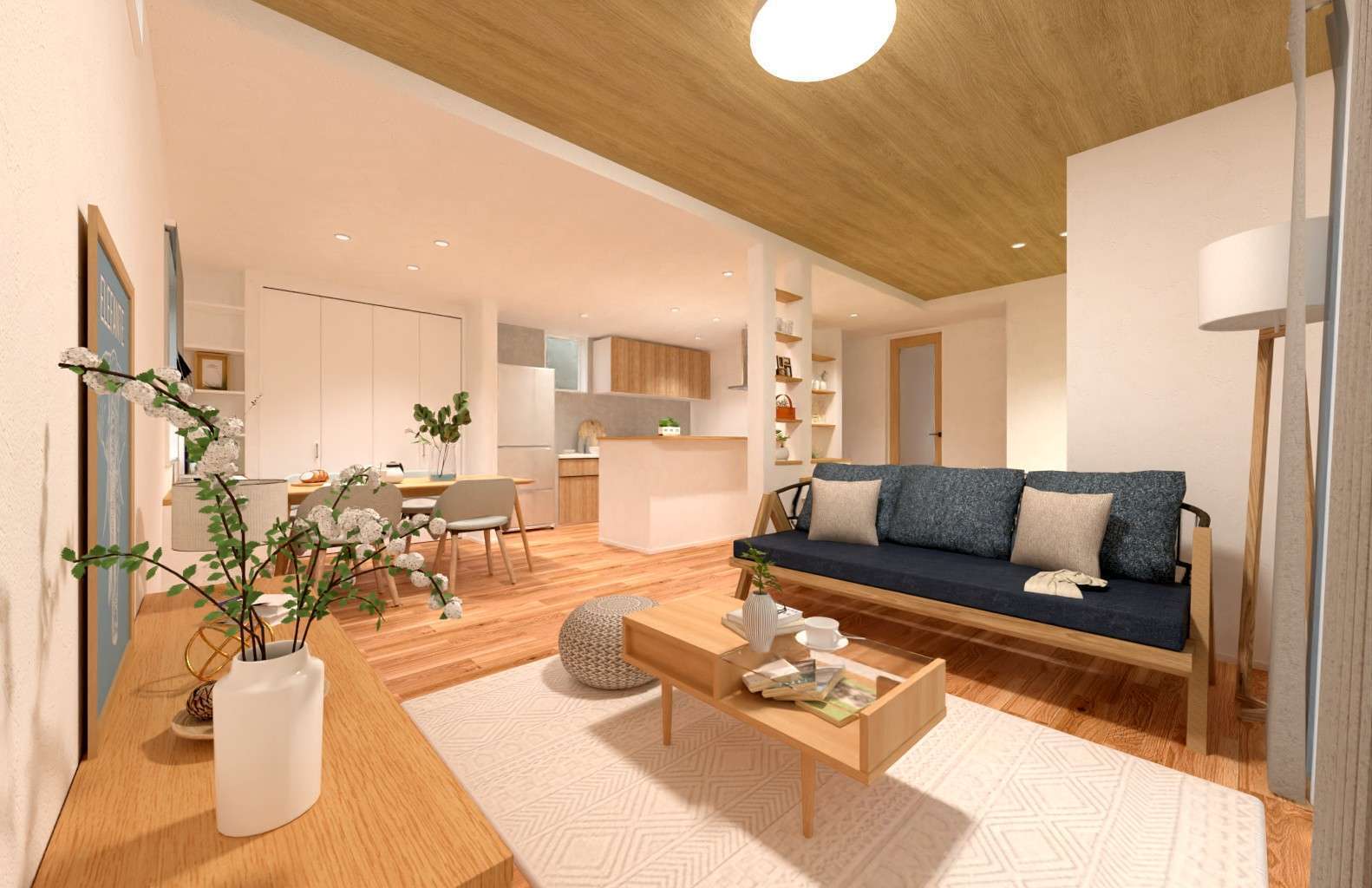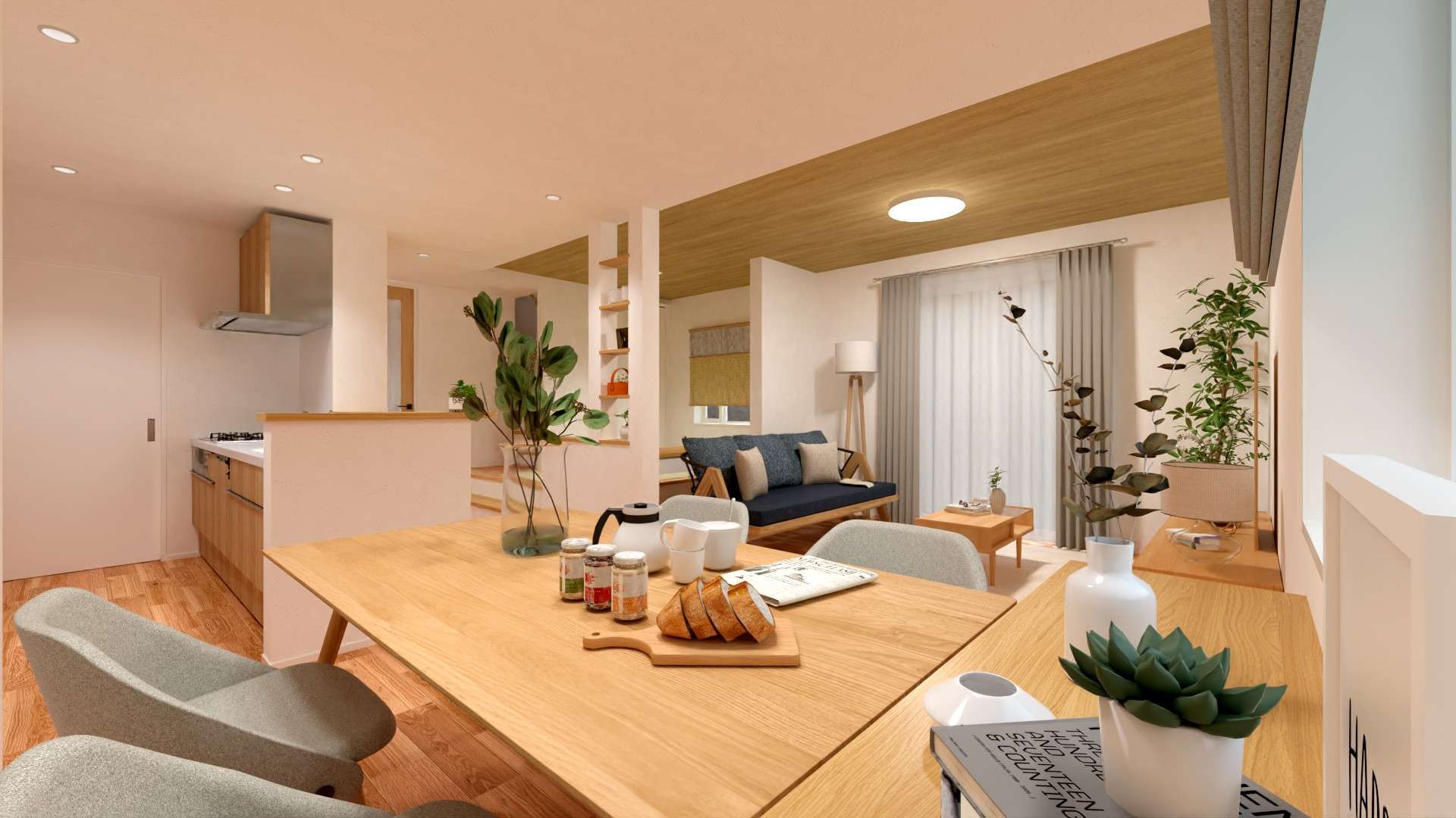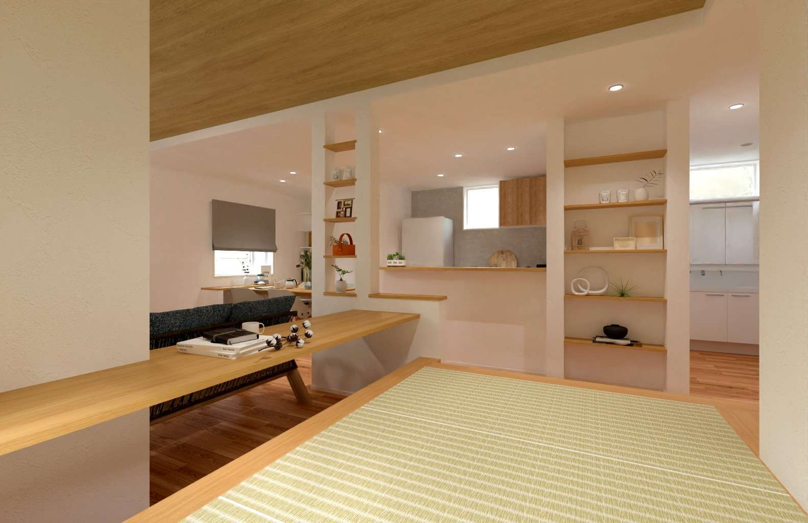キッチンからダイニング、リビング、畳コーナーまで見渡せる、開放感のある間取りです。どこにいても自然とコミュニケーションが生まれる、そんな暮らしがイメージできますね。木目の天井や、小上がりの畳コーナーが空間にアクセントを添えてくれています。