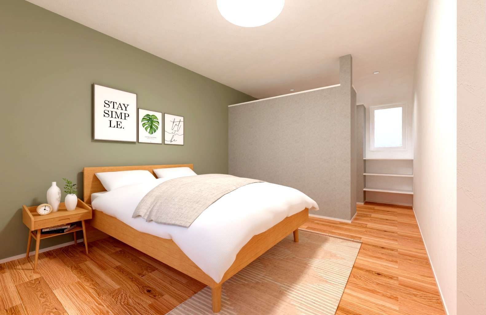 グレーとグリーン、2色のアクセントクロスでまとめた、落ち着きのある主寝室。ゆったりとした時間が過ごせそうですね🌿
