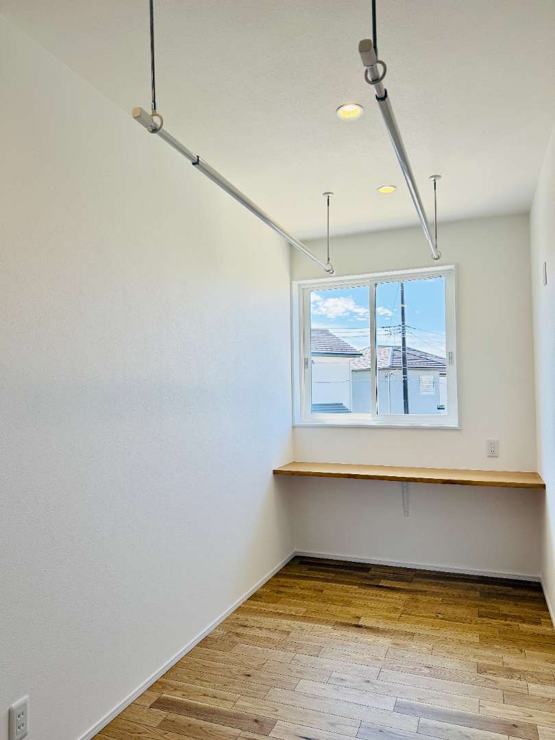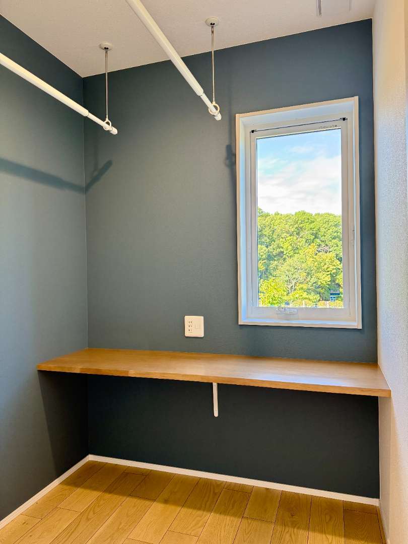 ブルーのアクセントクロスが目を引く家事室兼スタディーコーナーは、リビングとは、また違った雰囲気に✨窓の外には、公園の木々が広がっていて、日々の暮らしに癒しを添えてくれます🌿