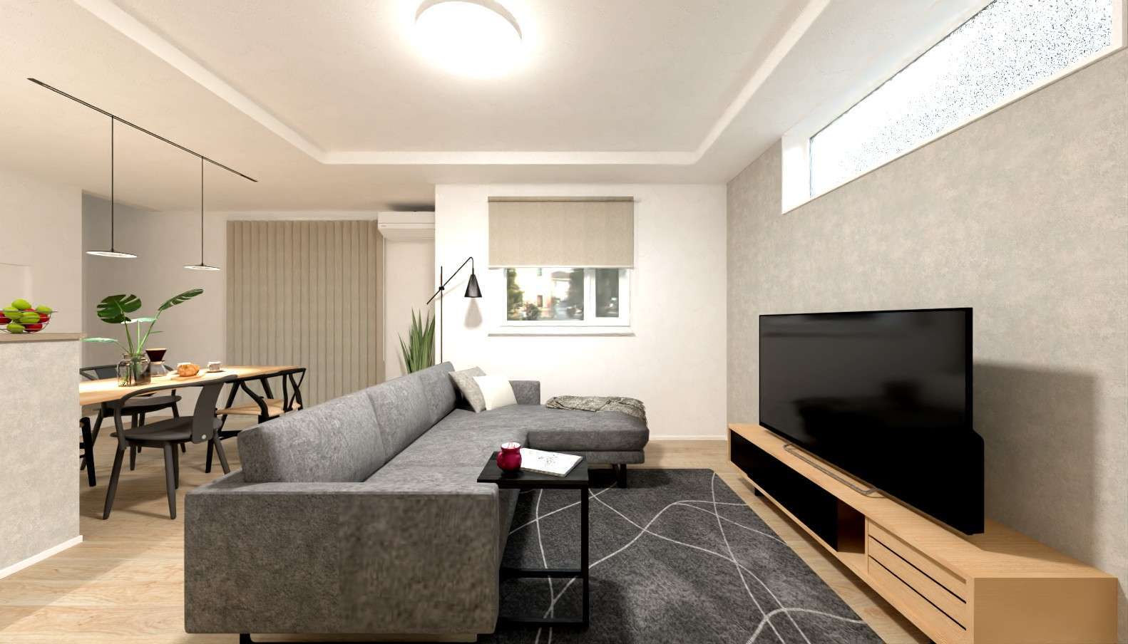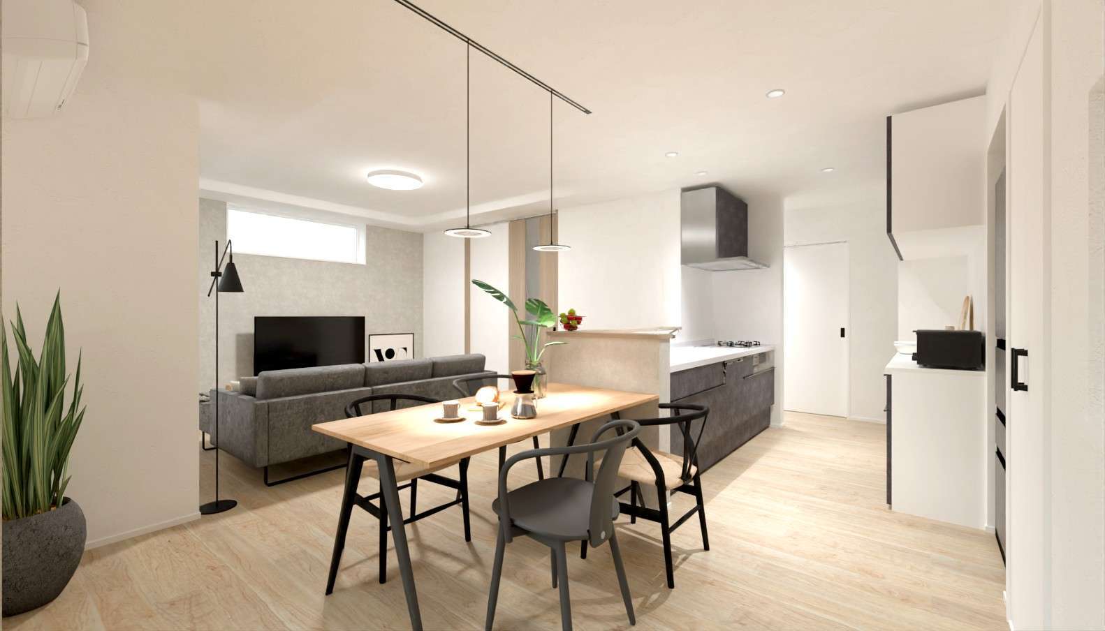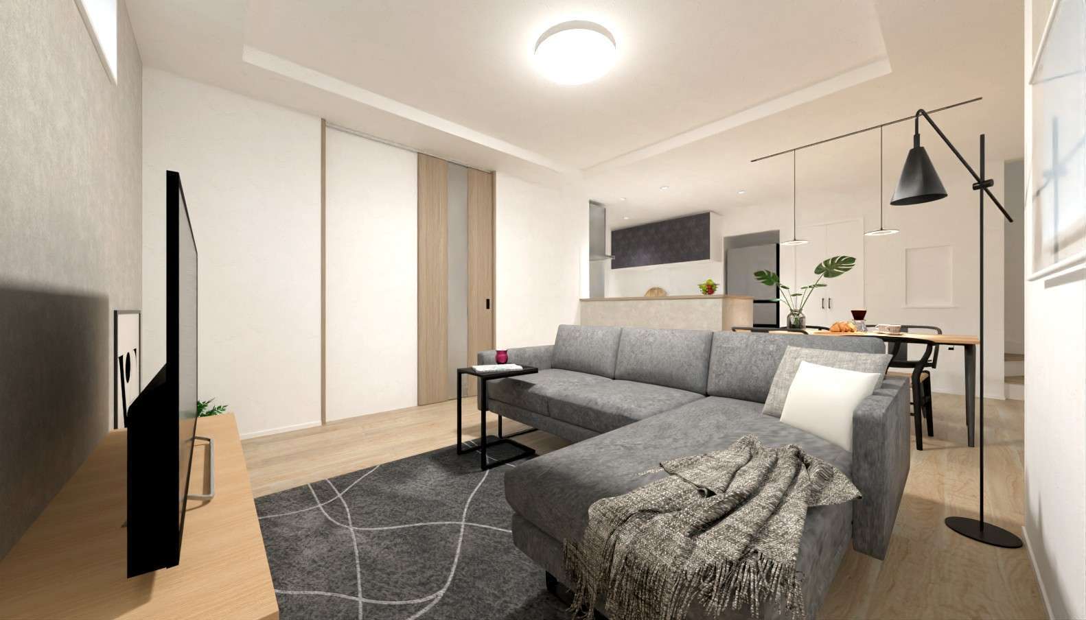 床や建具、キッチンをグレートーンでまとめた落ち着きのある「グレイッシュモダンスタイル」。フレームや脚にブラックを使った家具とも相性がよく、洗練された雰囲気を演出してくれます。