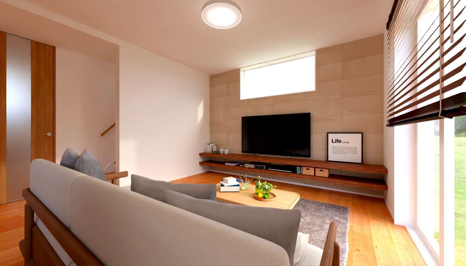 床材にはブラックチェリーを採用し、あたたかみのある上質な雰囲気に。造りつけのテレビボードと大伴のエコカラットが、リビングをほどよく落ち着いた高級感のある空間に仕上げています。