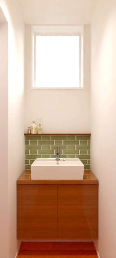 玄関ホールには手洗いコーナーを設置。正面のグリーンのタイルがいいアクセントになっています♪