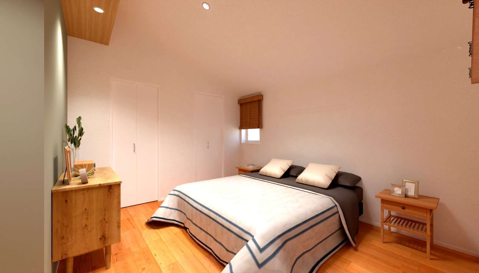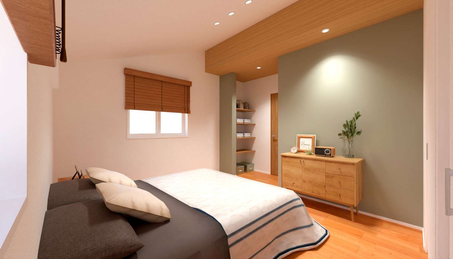 勾配天井が心地よい主寝室は、木目とグリーンのアクセントクロスで落ち着いた雰囲気に。ウォークインクローゼットが2つあるので、ご夫婦それぞれで使い分けができますよ。