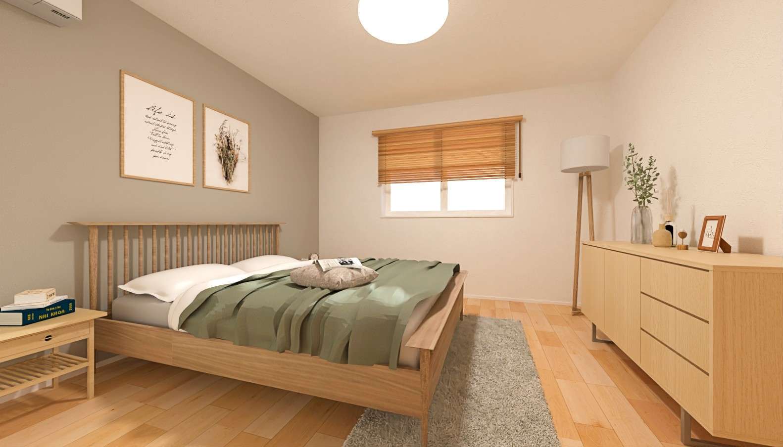 主寝室には、やさしい色合いのアクセントクロスを取り入れ、落ち着いた雰囲気に。