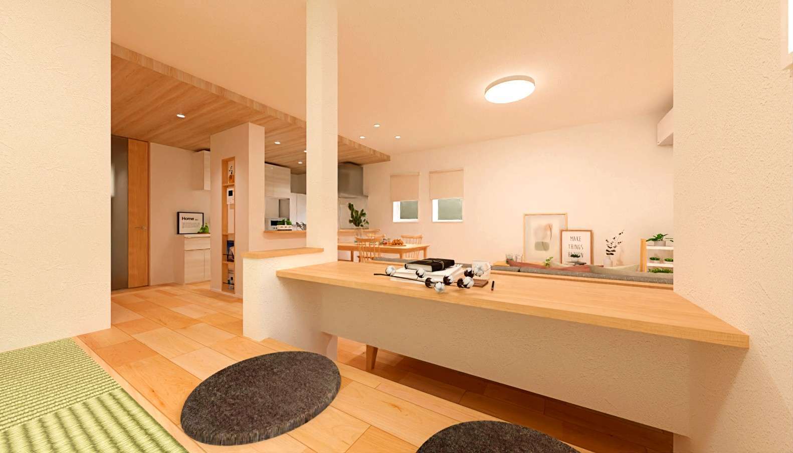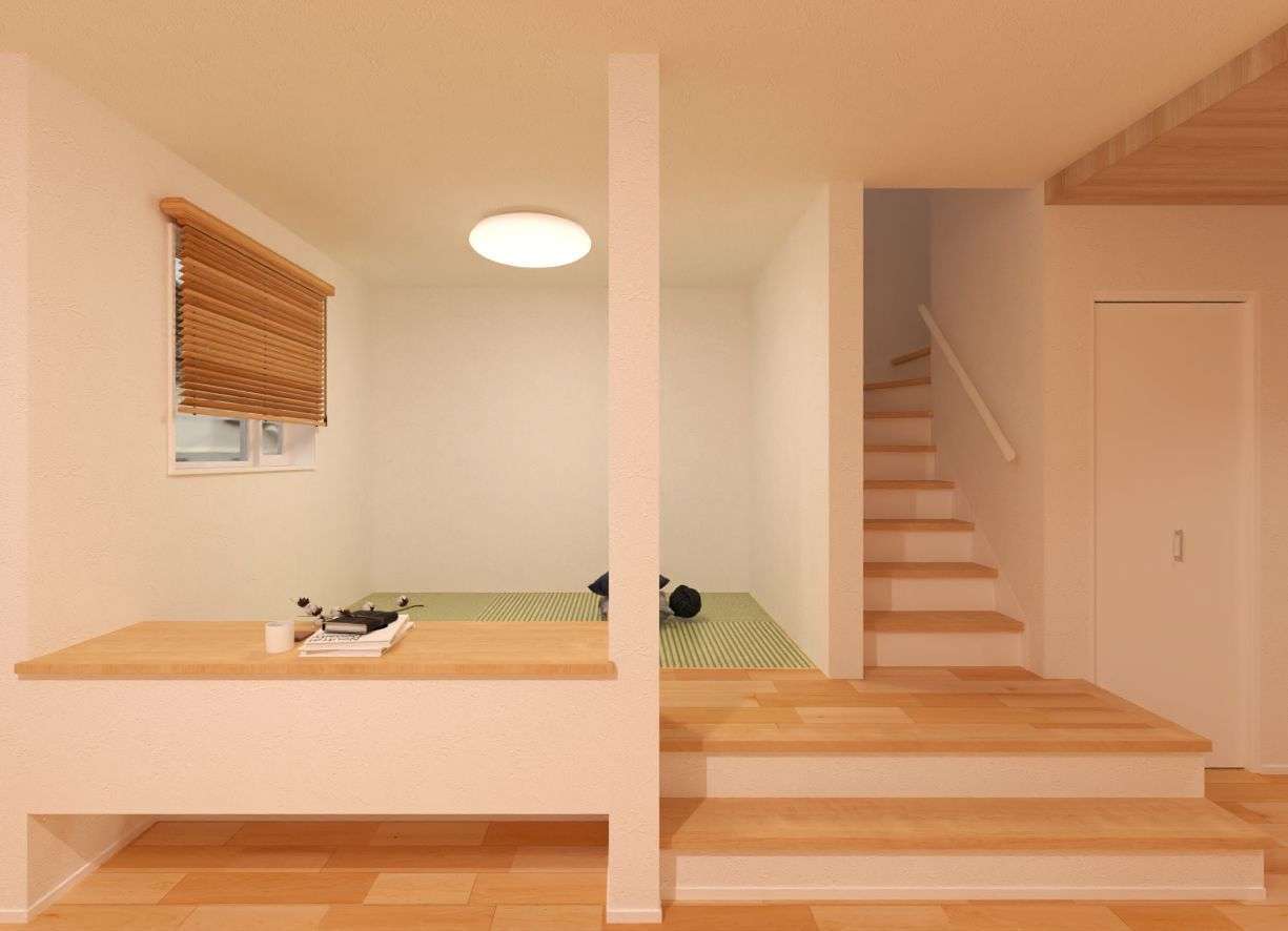 畳コーナーは、お子さまの遊び場やお昼寝スペースとしても大活躍👍小上がりへ上がる階段を広めにとることで、リビングとの一体感が生まれ、空間に広がりを感じられます。