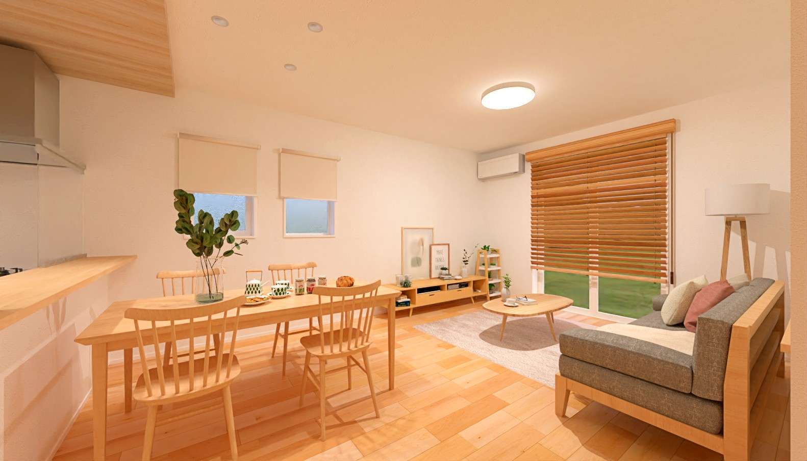 床材には、明るくやさしい色合いが魅力のハードメイプルを採用。空間全体がぱっと明るくなり、毎日を心地よく過ごせる仕上がりになっています。また、キッチン天井にはやさしい色合いの木目クロスを取り入れ、ほっと落ち着くナチュラルな雰囲気に仕上げました。