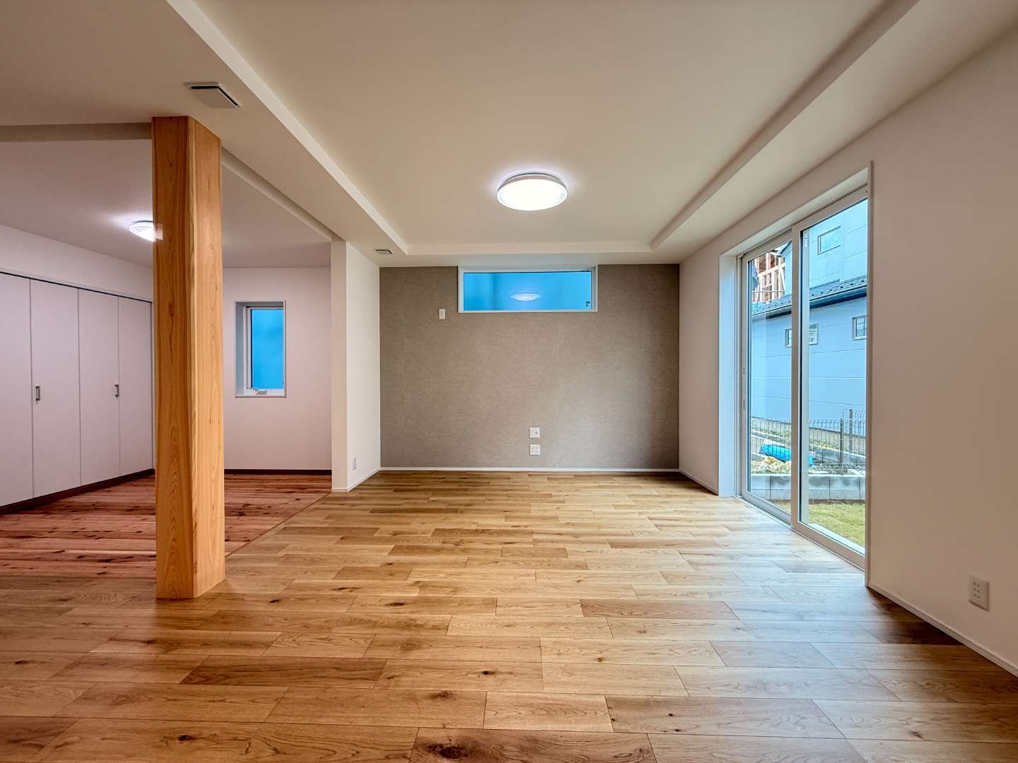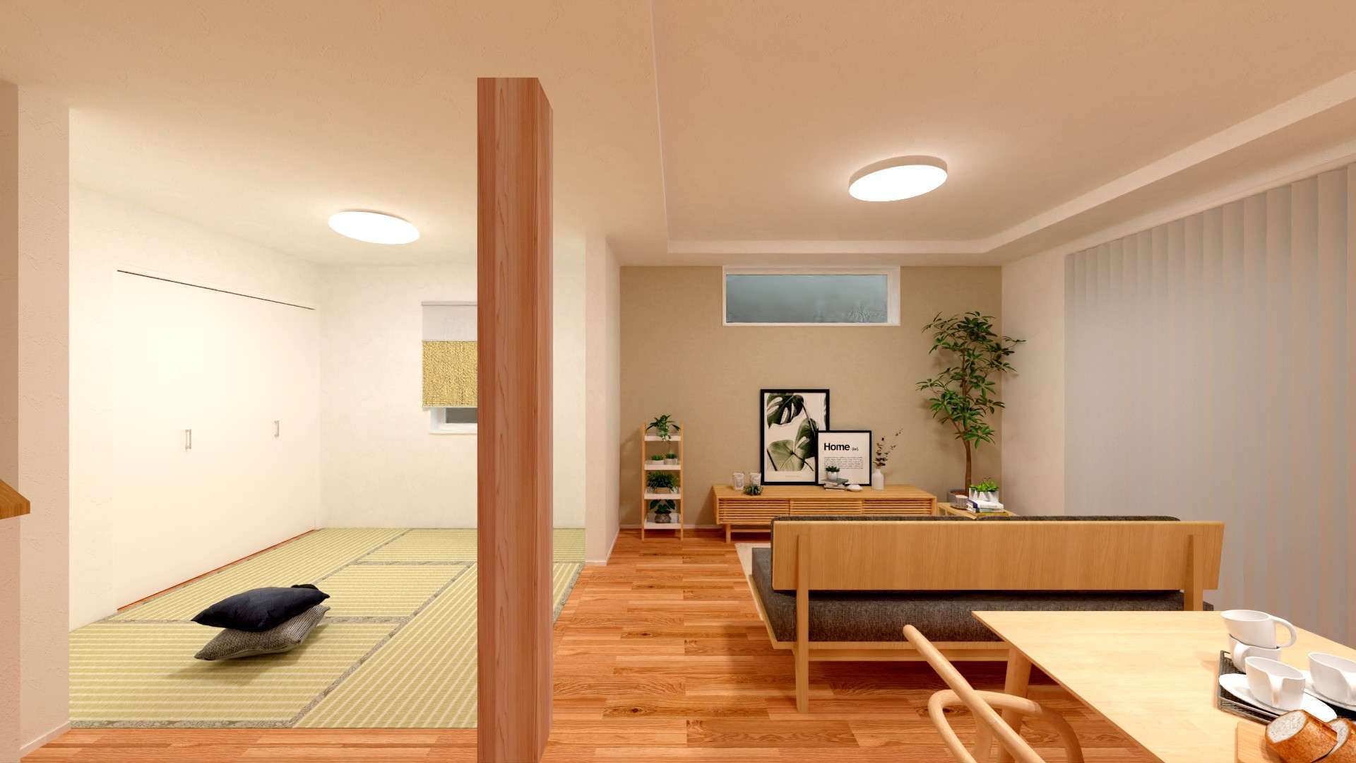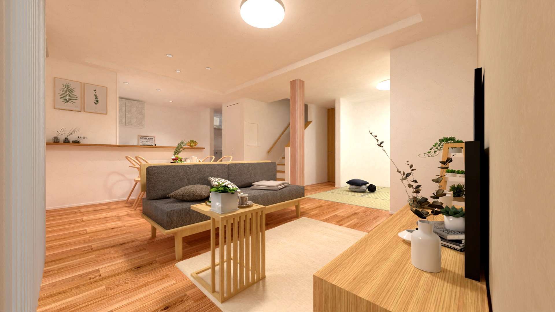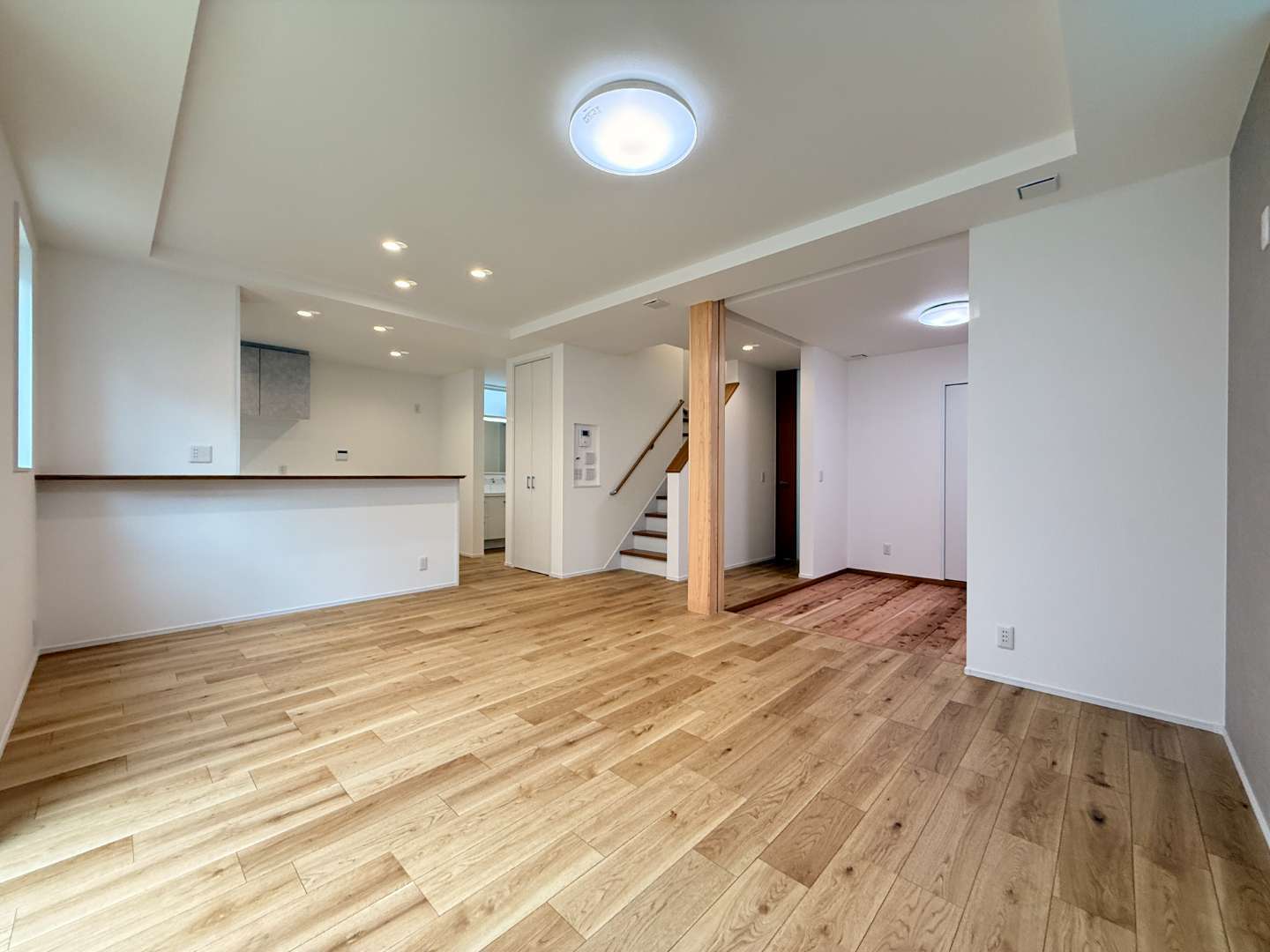 リビングと畳コーナーのあいだには、存在感のある 大黒柱 を配置。空間をやわらかく区切りつつ、お家のアクセントにもなっています。