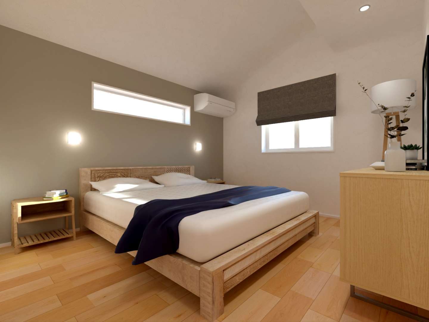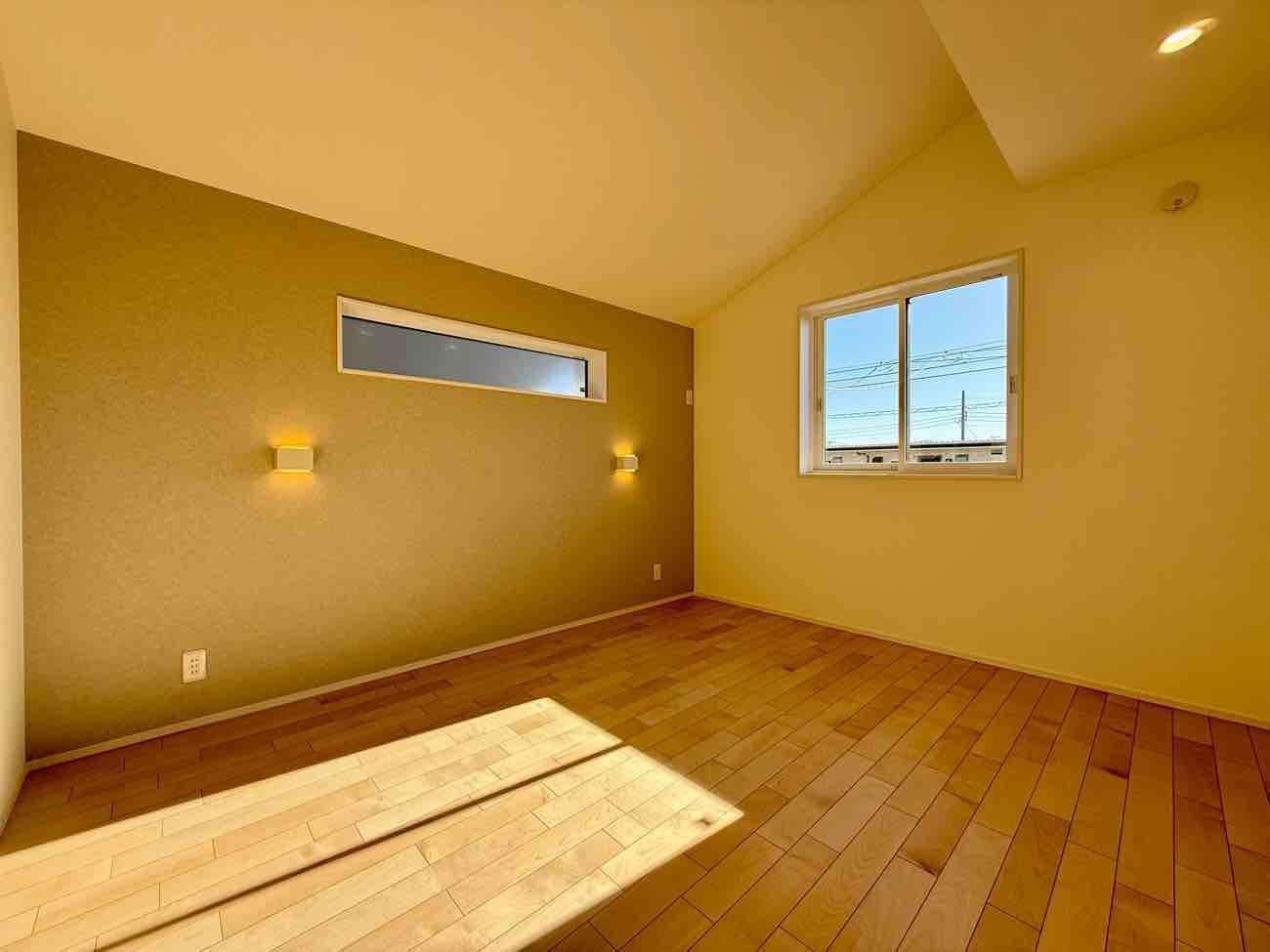 勾配天井で開放感のある主寝室。南向きでやわらかな日差しがたっぷり入ります☀️