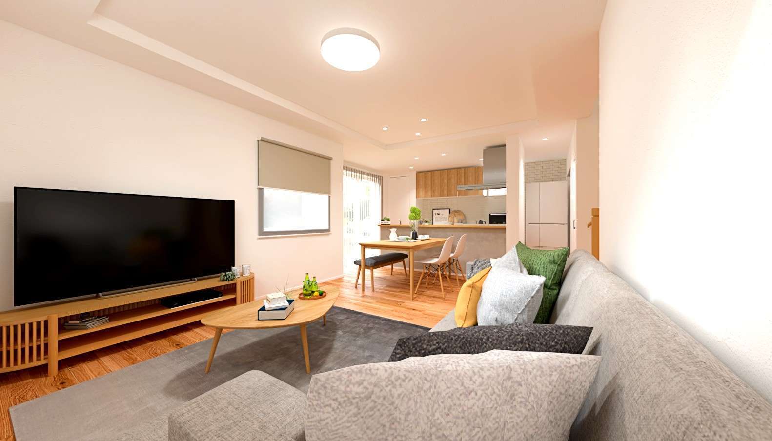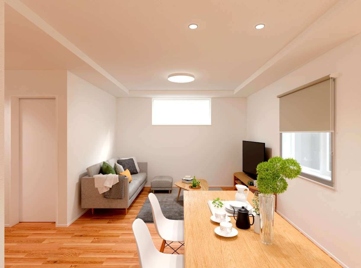 ダイニングとリビングは、自然と会話が弾むちょうどよい距離感。2か所の窓からたっぷりと差し込むやわらかな日差しが、明るく心地よいリビングをつくっています。